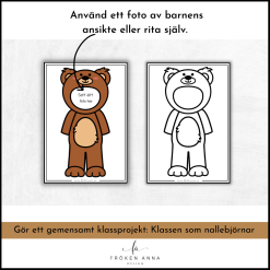 -Gemensam klassuppgift: Klassen som nallebjörnar. Ta ett foto på alla barn / elevers ansikten och sätt upp på nallebjörnarna. Låt dem färglägga sina björnar eller använd den färglagda bilden. Sätt på alla bilder på en vägg i klassrummet.