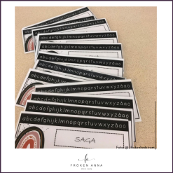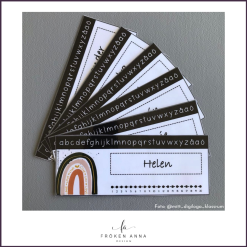 Rektangulär namnskylt i regnbågstema med alfabetet och talraden 1-20 som stöd. Namnskyltarna är redigerbara i Powerpoint och Keynote.