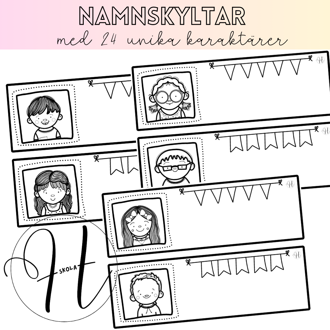 Namnskyltar till bänken eller lådan med 24 olika karaktärer som eleverna kan välja ut efter tycke och smak. De kan färglägga och skriva sitt eget namn på. Inkluderar också en redigerbar fil om du föredrar att skriva elevernas namn på datorn. Illustrationerna är ritade av mig och därför helt unika.