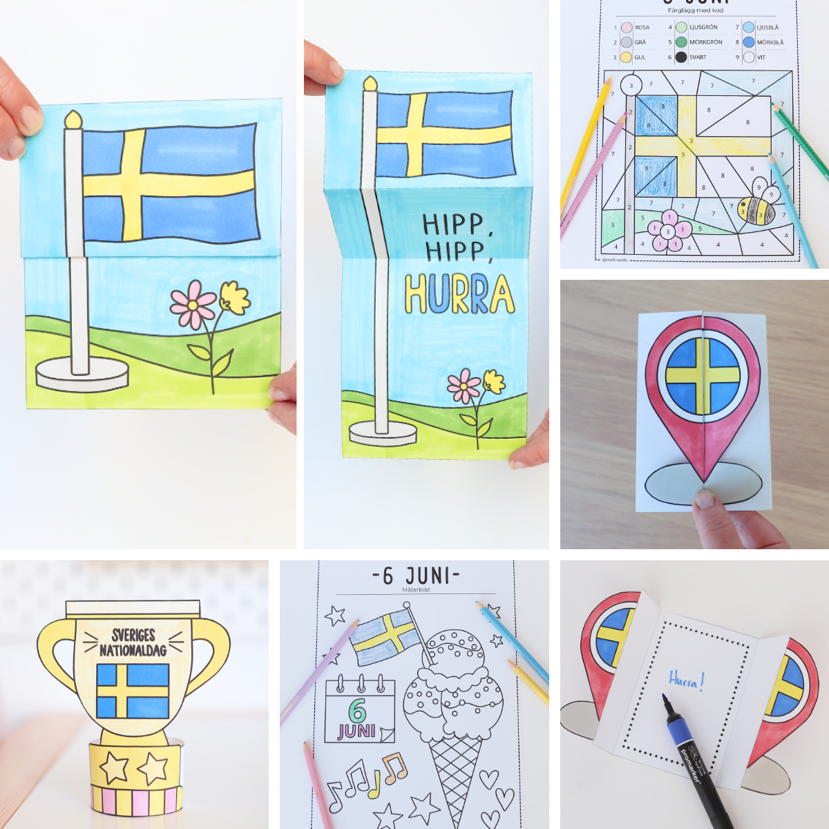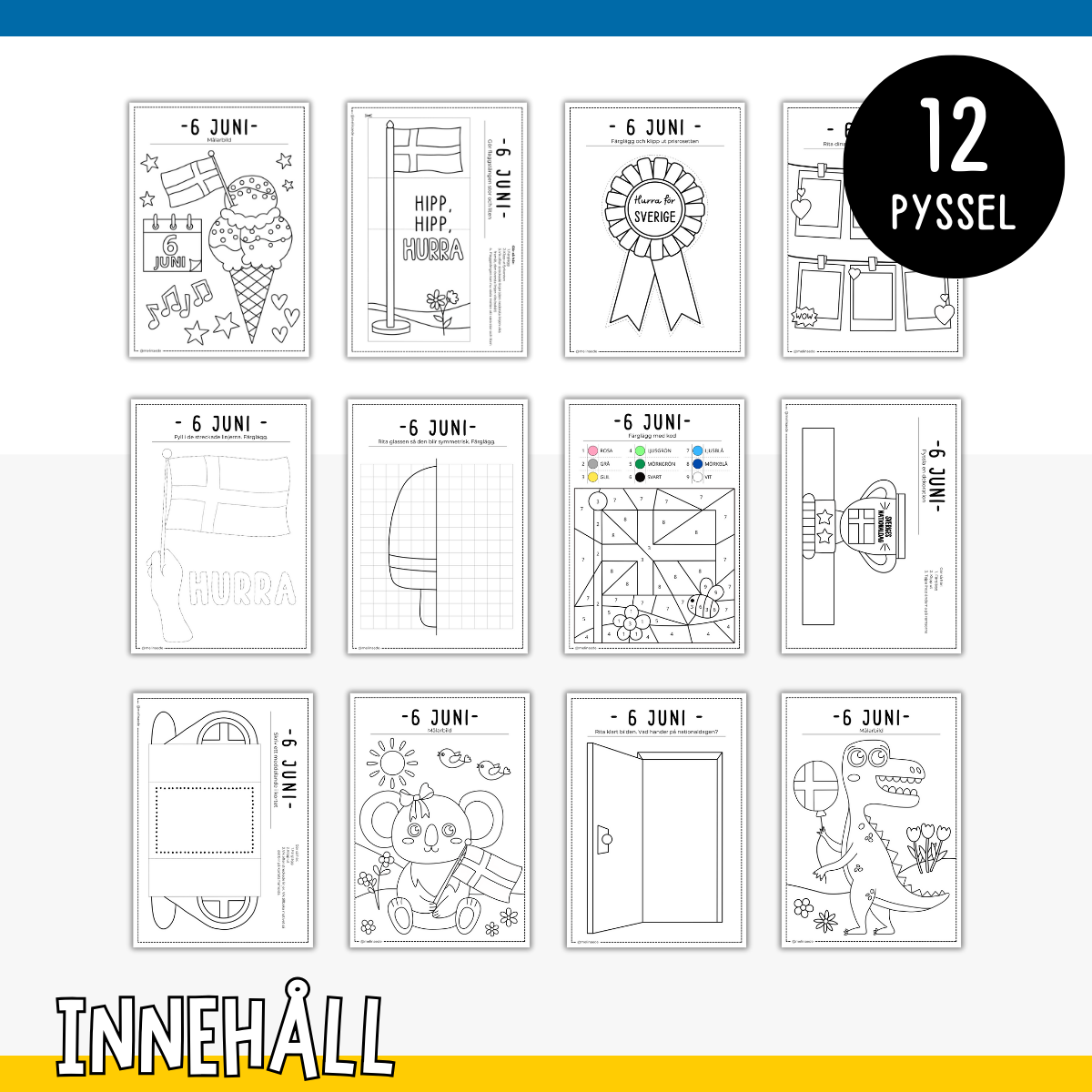 Pysselpaket med 12 pyssel till Sveriges nationaldag 6 juni. Innehåller bland annat målarbilder, öppningsbara kort, rita klart bilder, följ linjer, rita minnen och färglägg med kod.