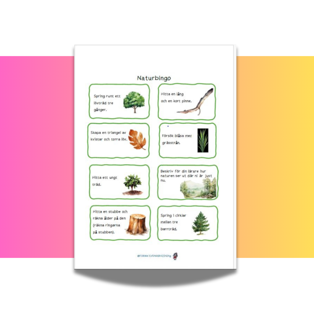 Väck barnens nyfikenhet med det här naturbingot. Bra icebreaker uppgift om man har en ny grupp elever. Naturbingo med uppdrag som behandlar ämnena svenska, matematik och NO på ett roligt sätt. Barnen får röra sig medans de utför uppdragen. Fungerar för alla årskurser.