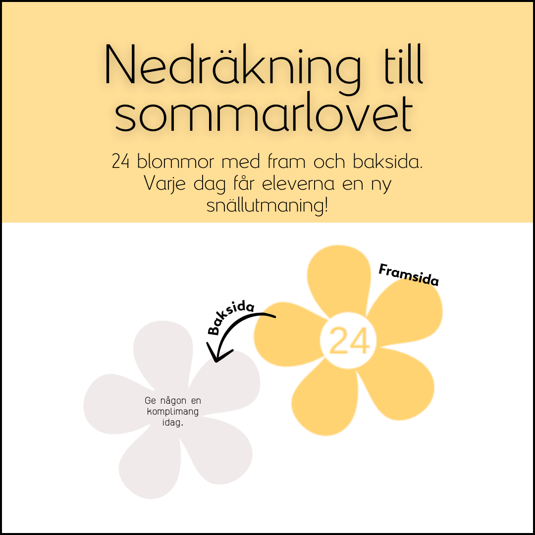 Nu är det inte långt kvar till sommarlovet. Här kommer 24st blommor med fram och baksida. Klipp ut blommorna och sätt dem på väggen i klassrummet. Varje dag tar ni bort en blomma och läser uppmaningen på baksidan. Varje uppmaning har med snällhet att göra. Ett bra sätt att avsluta terminen på ?