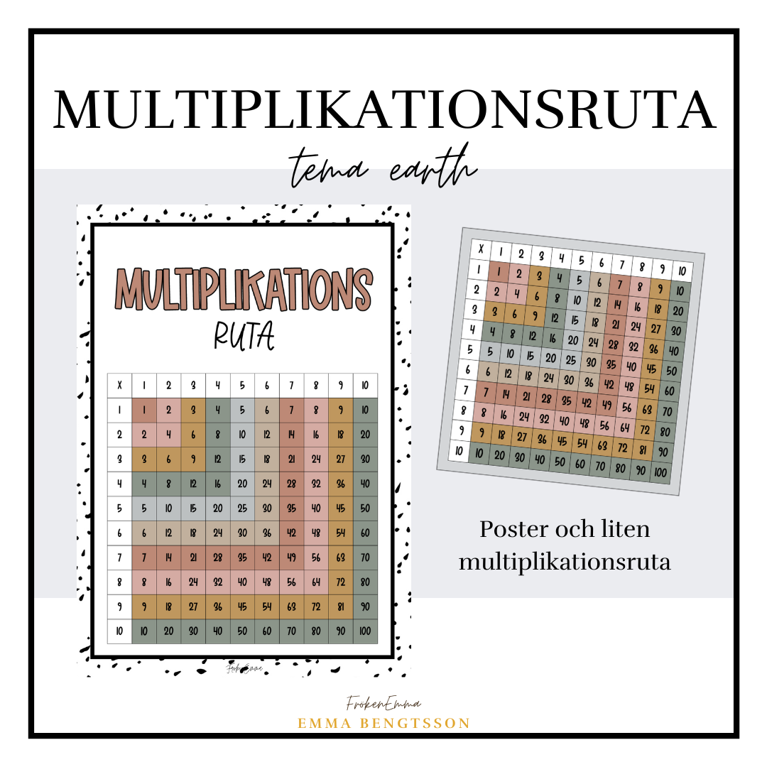 En multiplikationsruta som passar att sätta upp i klassrummet (skriv ut i a3) samt en mindre som eleven kan använda som stöd vid sig under sitt arbete (skriv ut i a4). Jordnära tema.