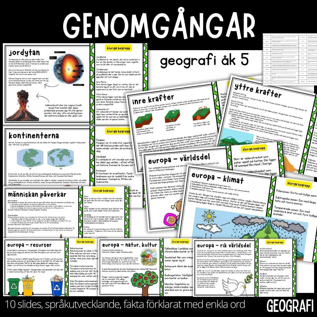 Ta hjälp av denna presentation när du ska arbeta med jordytan och Europa. Presentationen är på 10 slides, 9 genomgångar med olika teman, 1 slide med begreppsschema för att tydliggöra svåra och ämnesspecifika begrepp.