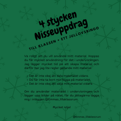 Nu när det börjar nära sig jul är det på tiden att ordna lite Nissebrev till eleverna. Materialet innehåller fyra stycken brev (tänkte en till varje advent) och ett Jullovsbingo. Breven innehåller uppdrag till eleverna som kan göras enskilt i par/grupp eller hela klassen tillsammans.