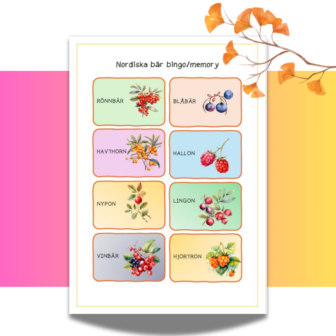 Memory med nordiska bär. Passar alla elever men särskilt SVA och språkträning. Tydliga fina bilder.