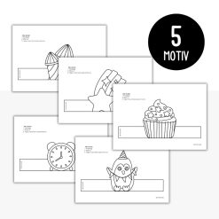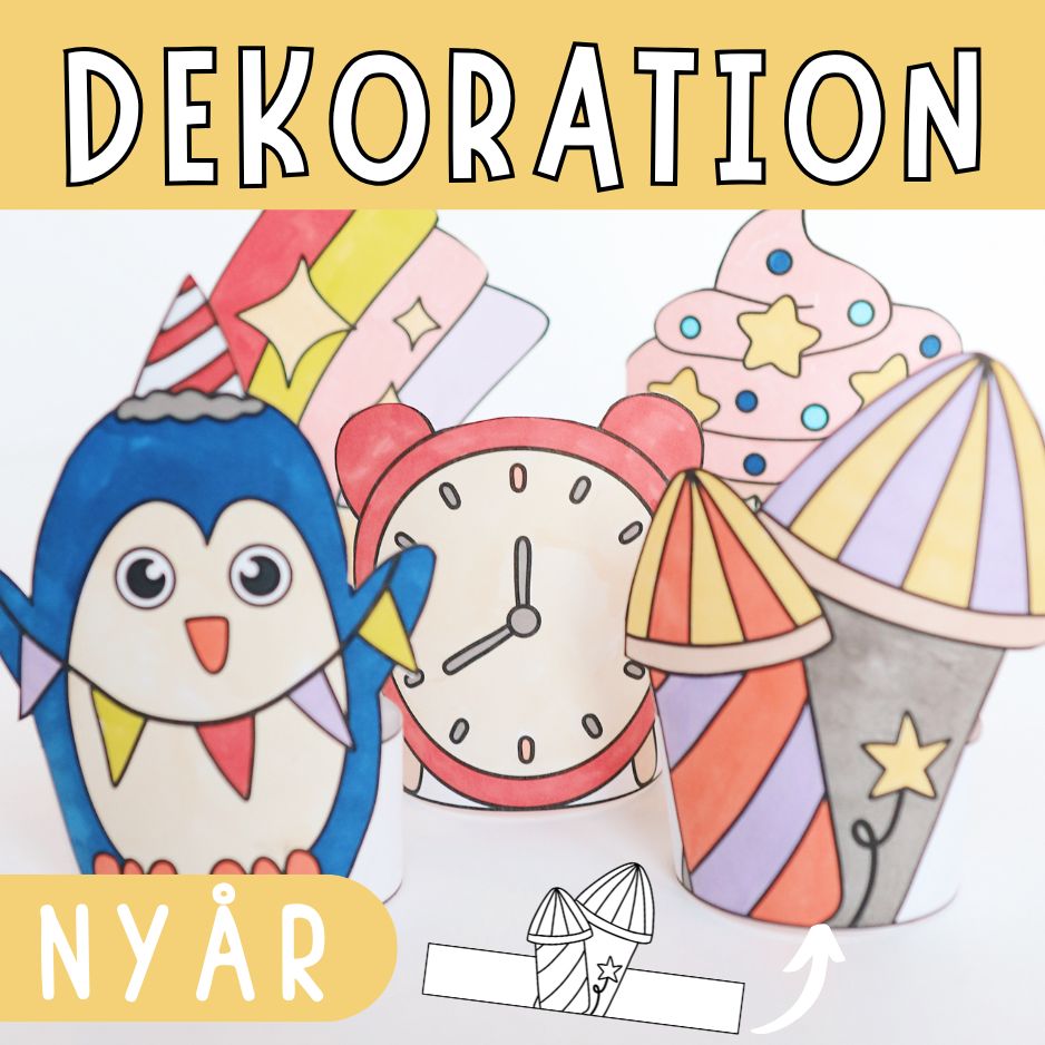 Mallar för att pyssla egen dekoration till nyår. Figurerna kan stå upp med hjälp av remsan som tejpas ihop till en ring på baksidan. Innehåller fem motiv: nyårsraket, stjärnfall, klocka, pingvin med dekoration och muffins med stjärnor.