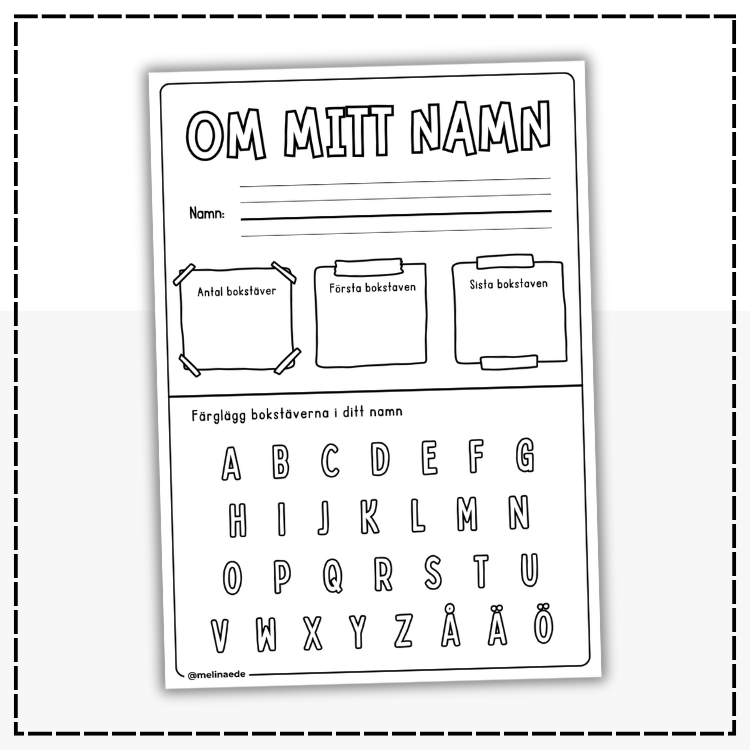 Blad om mitt namn. Ta reda på hur många bokstäver namnet innehåller, vilken bokstav som är först och vilken som är sist.