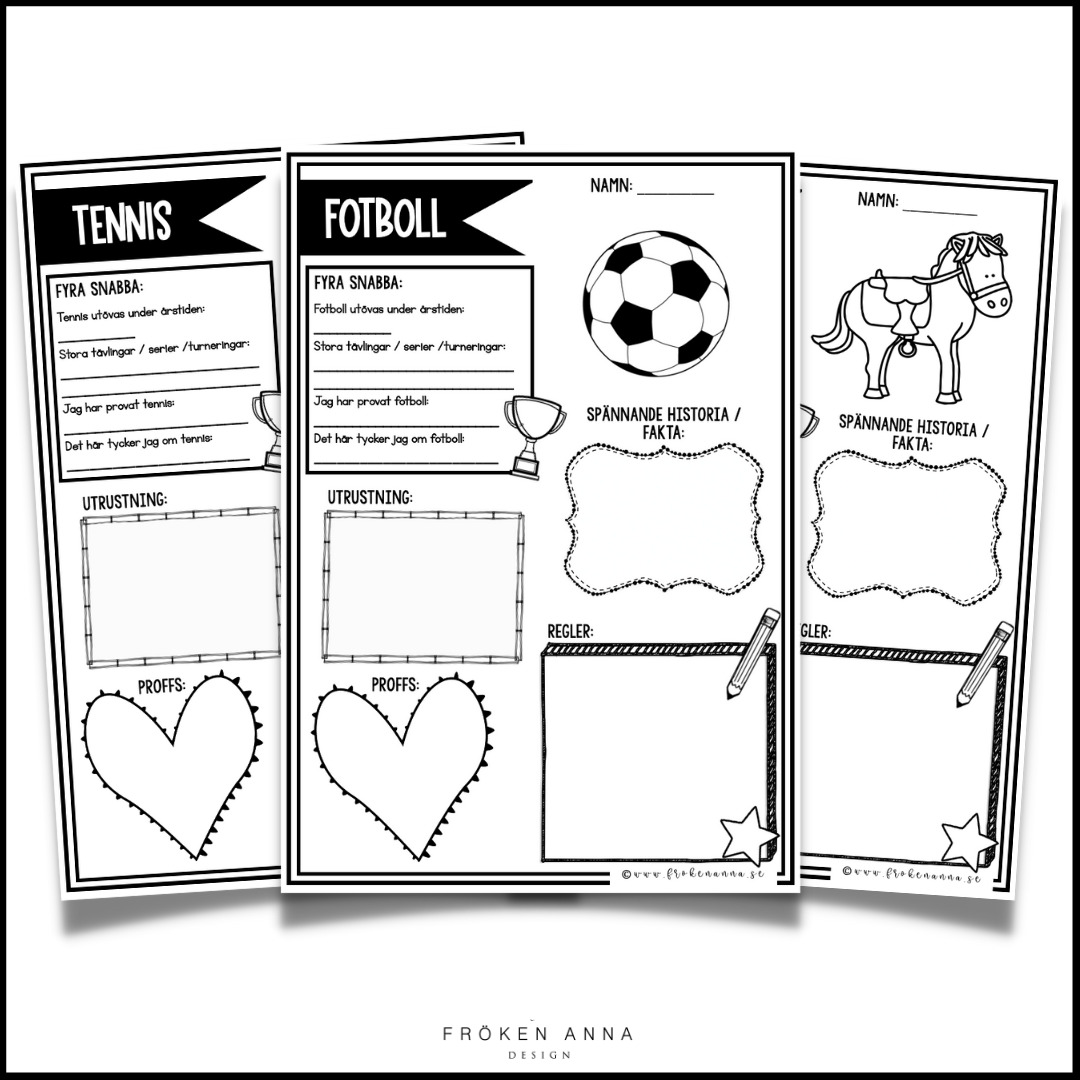 Locka till skrivande och låt eleverna skriva om sin favoritsport. I paketet ingår en tom mall för att fylla i valfritt sportnamn och rita logga, samt färdiga mallar för följande sporter: