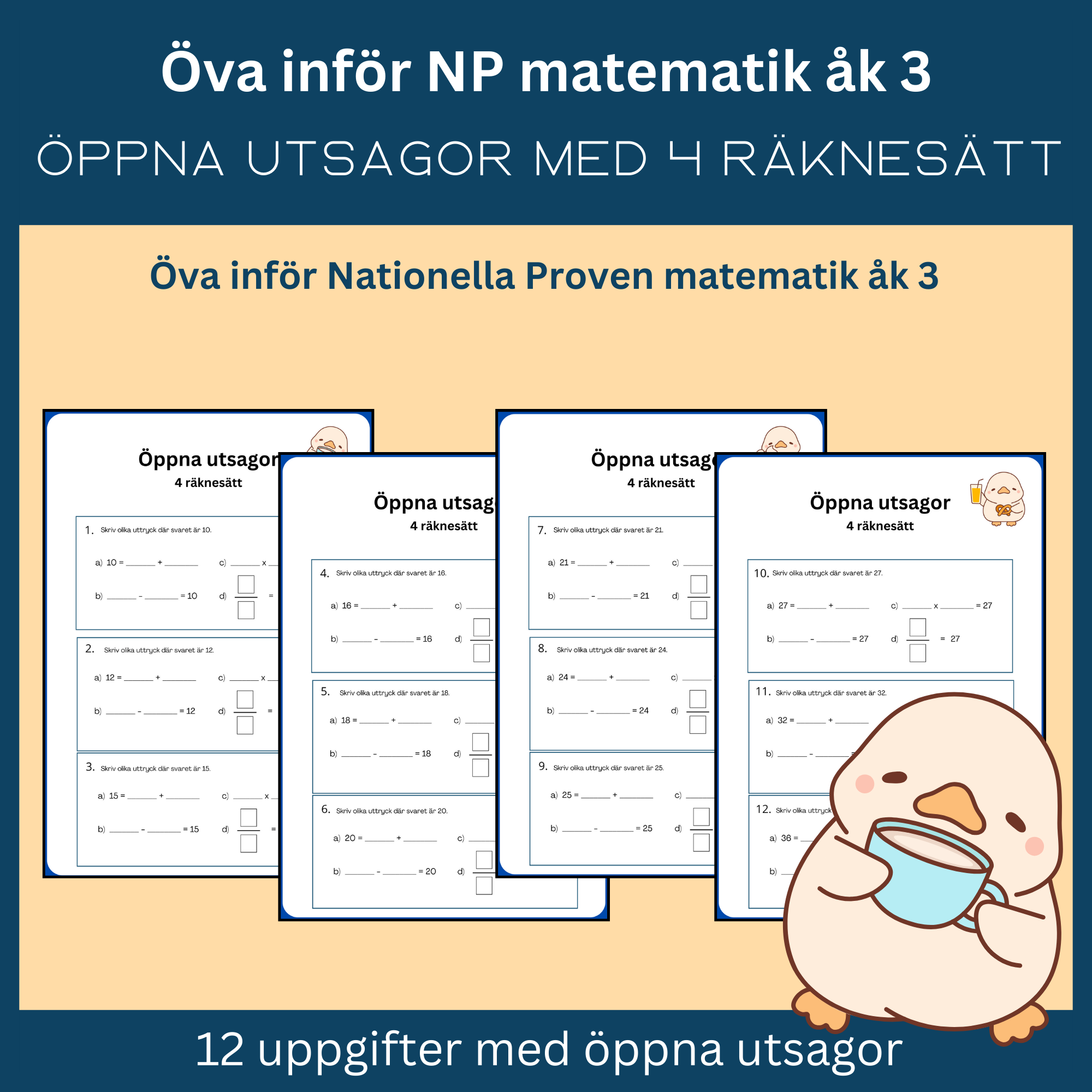Detta ingår i Öppna utsagor, 4 räknesätt, 12 uppgifter, öva inför NP matematik åk 3