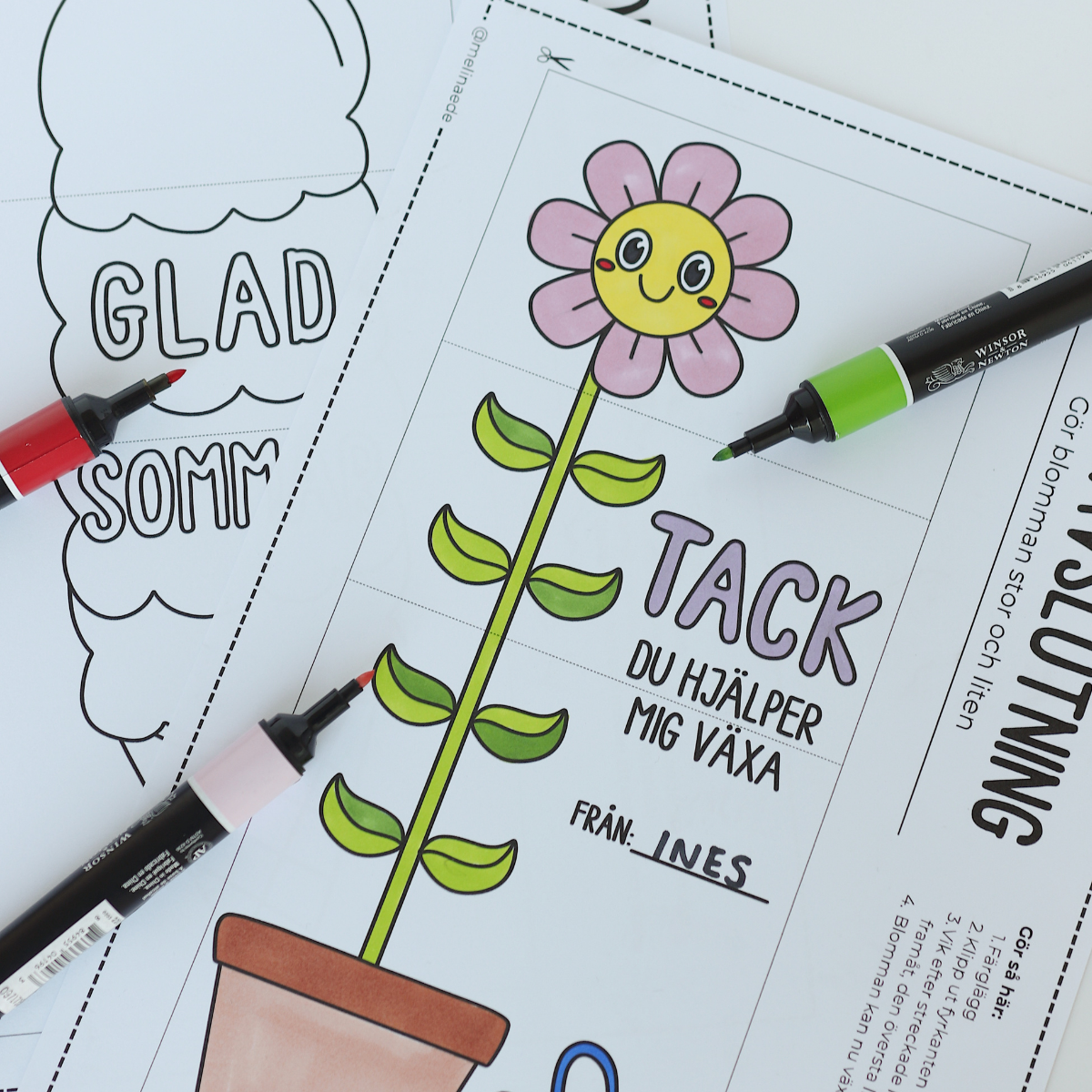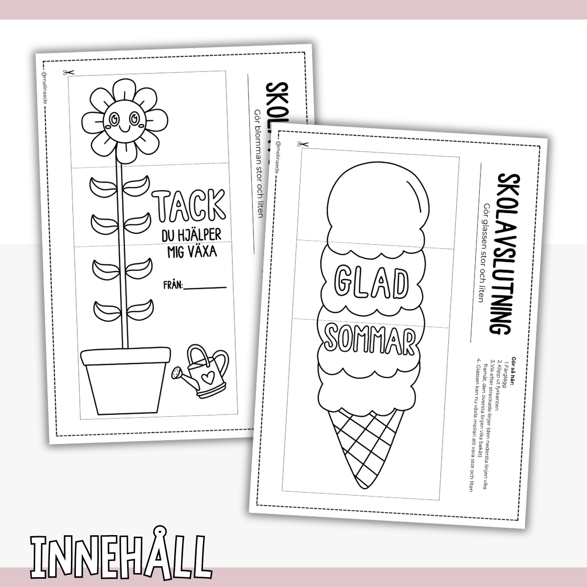 Öppningsbara kort att ge bort på skolavslutningen till lärare, pedagog eller annan person som varit betydelsefull under terminen. Innehåller två varianter: