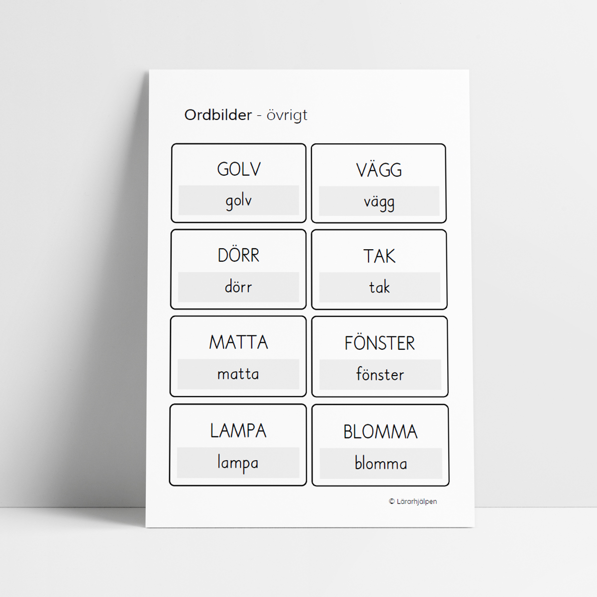 Ordbilder som du kan sätta upp hemma, i förskolan, skolan eller fritids för att barnen ska träna på att se ord. Varje ord står med gemener och versaler. Typsnittet som används i dokumentet ägs av Skolplus AB.