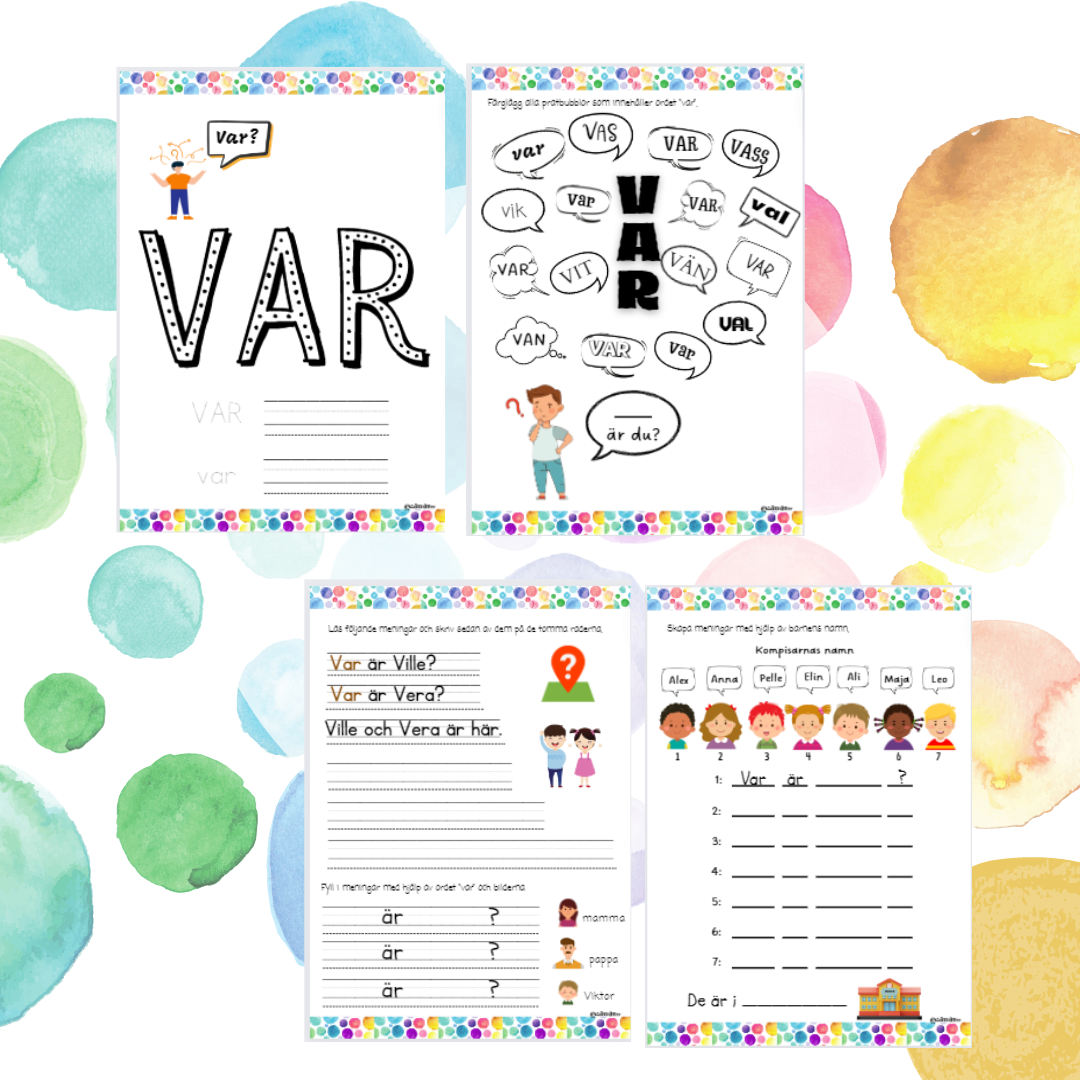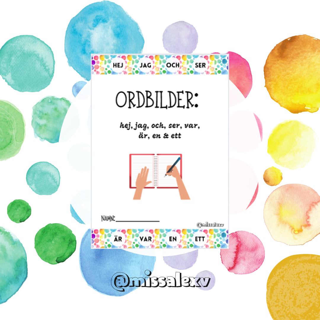 Ett arbetshäfte på 32 sidor för att träna på ordbilderna: HEJ, JAG, OCH, SER, VAR, ÄR, EN & ETT på ett mer utmanande sätt. Det är 4 arbetsblad för varje ordbild. Arbetshäftet är välanpassad till åk1.
