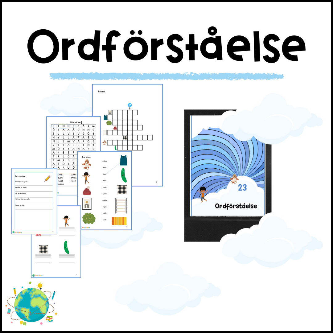 Ordförståelse 23 är en fortsättning på de tidigare häftena. I häftet tränar eleverna på dubbelteckning med 2 konsonanter. Häftet består av korta ord med 5 bokstäver.