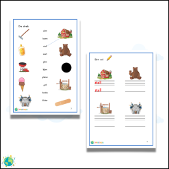 I häftet tränar eleverna på dubbelteckning med 2 konsonanter på två ställen i ordet.