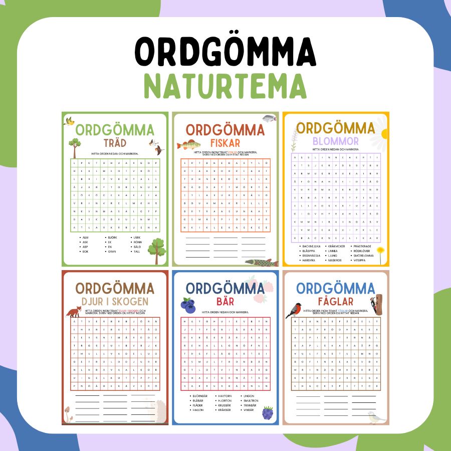6 olika ordgömmor med naturtema. Ordgömmorna är: