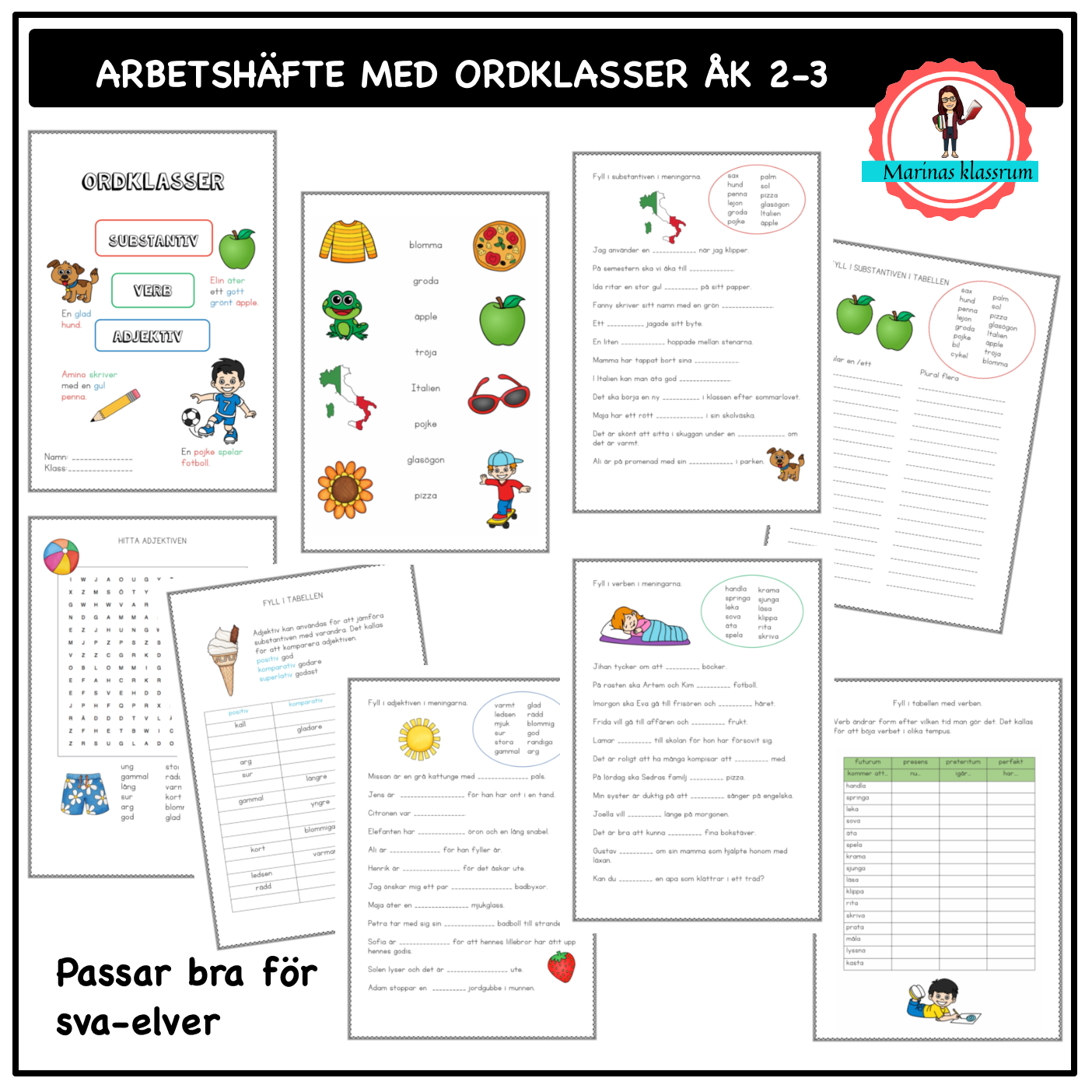 Materialet passar även bra till SVA-elever och åk 2-3. På varje ordklass tränas 16 olika ord som återkommer med bildstöd i olika övningar: ordförståelse genom att leta efter ordet, sätta in ordet i meningar och skriva egna meningar med ordet. Häftet avslutas med två övningar med de olika ordklasserna blandade.