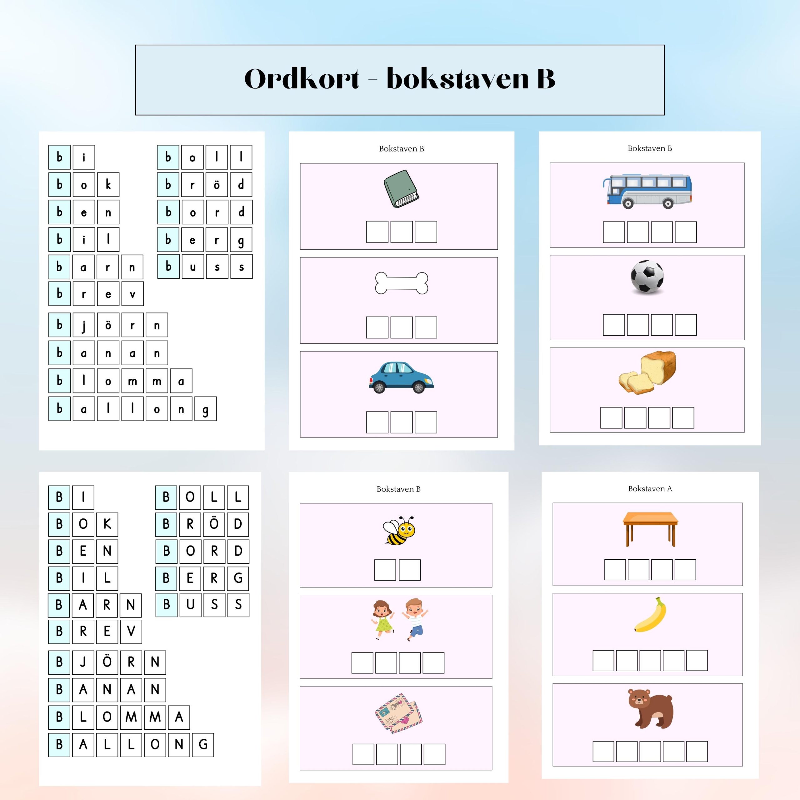 Ordkort som behandlar bokstaven B. Perfekt att ha när eleverna ska lära sig om bokstaven B. Laminera in korten och välj själv om eleverna ska skriva direkt på korten, eller matcha ihop det skrivna ordet med bilden. Bokstaven B är färgmarkerad för att göra eleverna uppmärksamma på hur bokstaven ser ut och i vilka ord som bokstaven frekvent förekommer i. Ordkorten finns med både versaler och gemener för att kunna differentiera undervisningen efter elevernas behov.