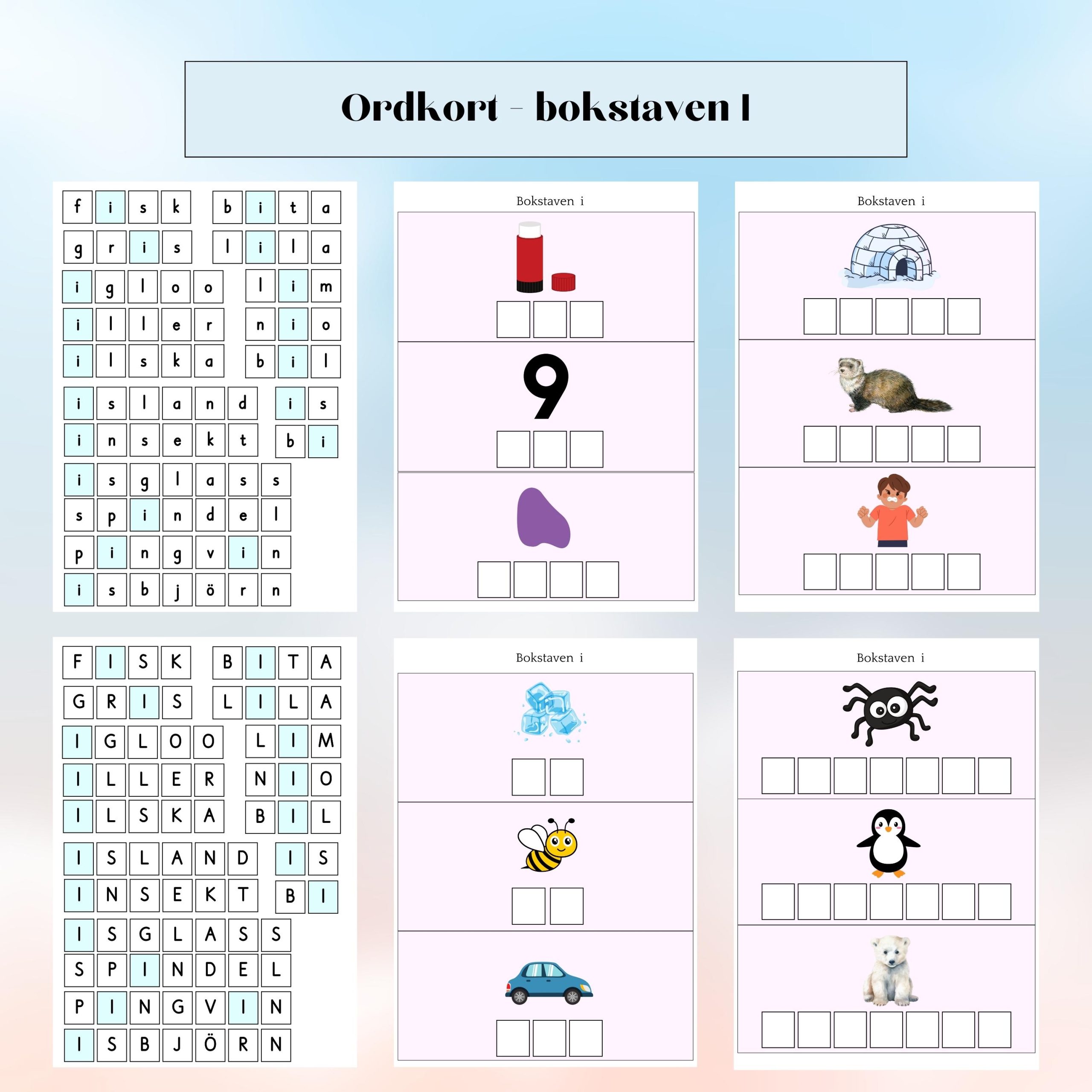 Ordkort som behandlar bokstaven I. Perfekt att ha när eleverna ska lära sig om bokstaven I. Laminera in korten och välj själv om eleverna ska skriva direkt på korten, eller matcha ihop det skrivna ordet med bilden. Bokstaven I är färgmarkerad för att göra eleverna uppmärksamma på hur bokstaven ser ut och i vilka ord som bokstaven frekvent förekommer i. Ordkorten finns med både versaler och gemener för att kunna differentiera undervisningen efter elevernas behov.