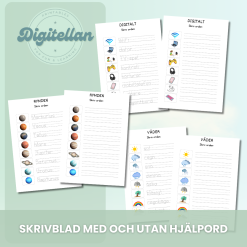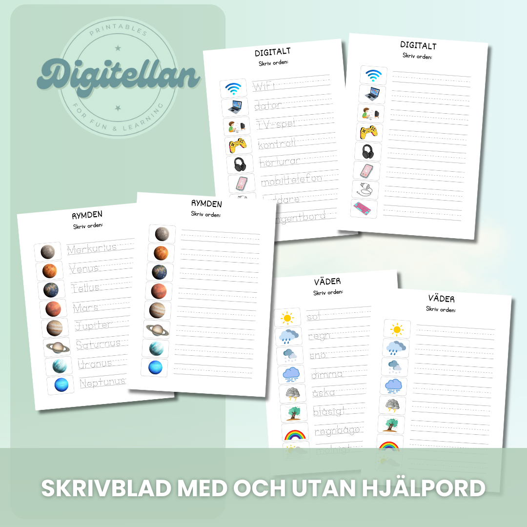 Ett stort paket med 280 st ordkort och tillhörande skrivblad. Klipp ut korten och laminera för att använda om och om igen. Skrivbladen som hör till kommer i två olika varianter, med och utan hjälpord. Ett perfekt paket för att träna ordförståelse, läsning, skriva och svenska som andraspråk.