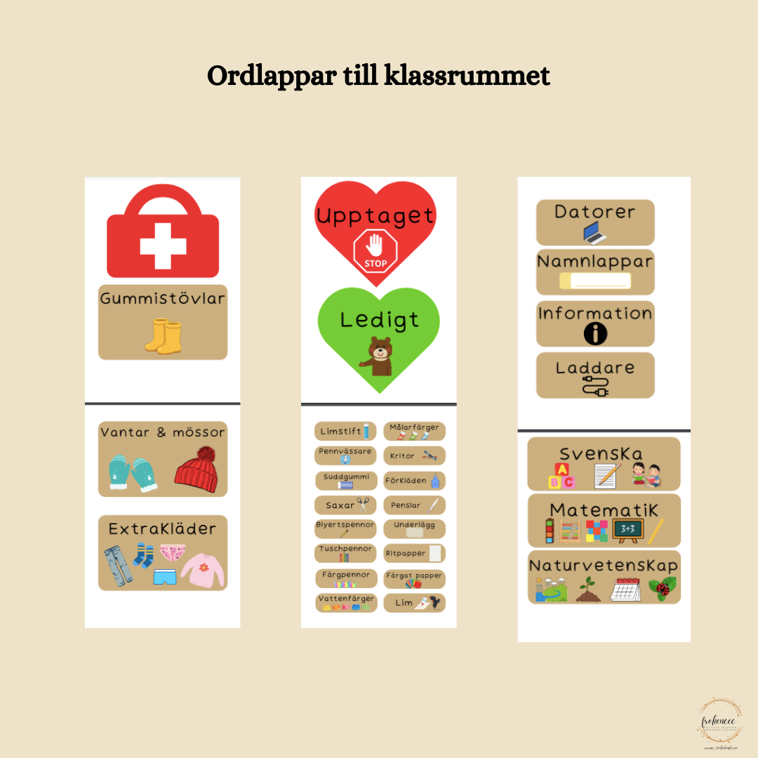 Materialet innehåller flera olika ordlappar att använda i klassrummet för en tydligare struktur.