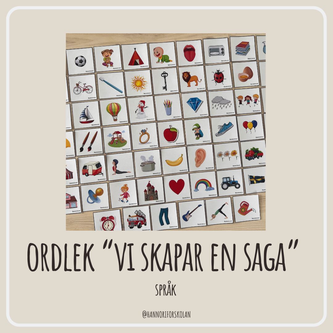 Ordlek ”vi skapar en saga” – vänd alla korten upp och ner. Låt barnen ta varsitt koty och skapa en eller flera meningar utifrån bilden. Tillsammans skapar barnen en saga utifrån bilderna de får. Inledningsvis behövs nog en del stöttning från en vuxen, men vår erfarenhet säger att barnen snabbt kommer in i hur man ska tänka och tycker att det är väldigt roligt.