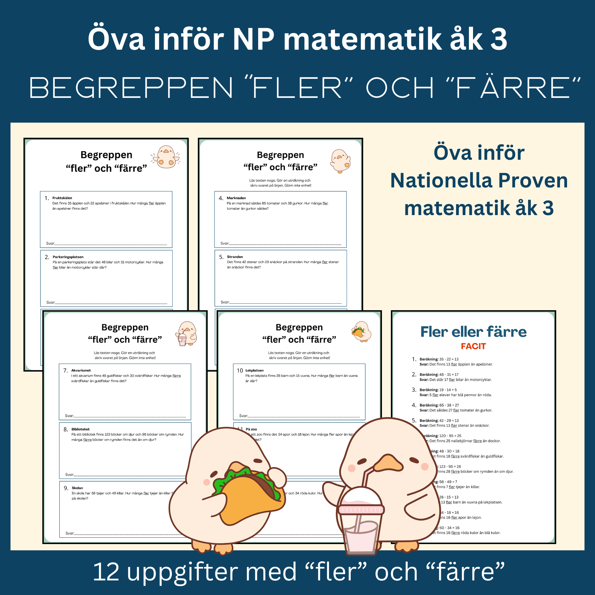 Öva begreppen ”fler” och ”färre” med 12 problemlösningsuppgifter samt facit.