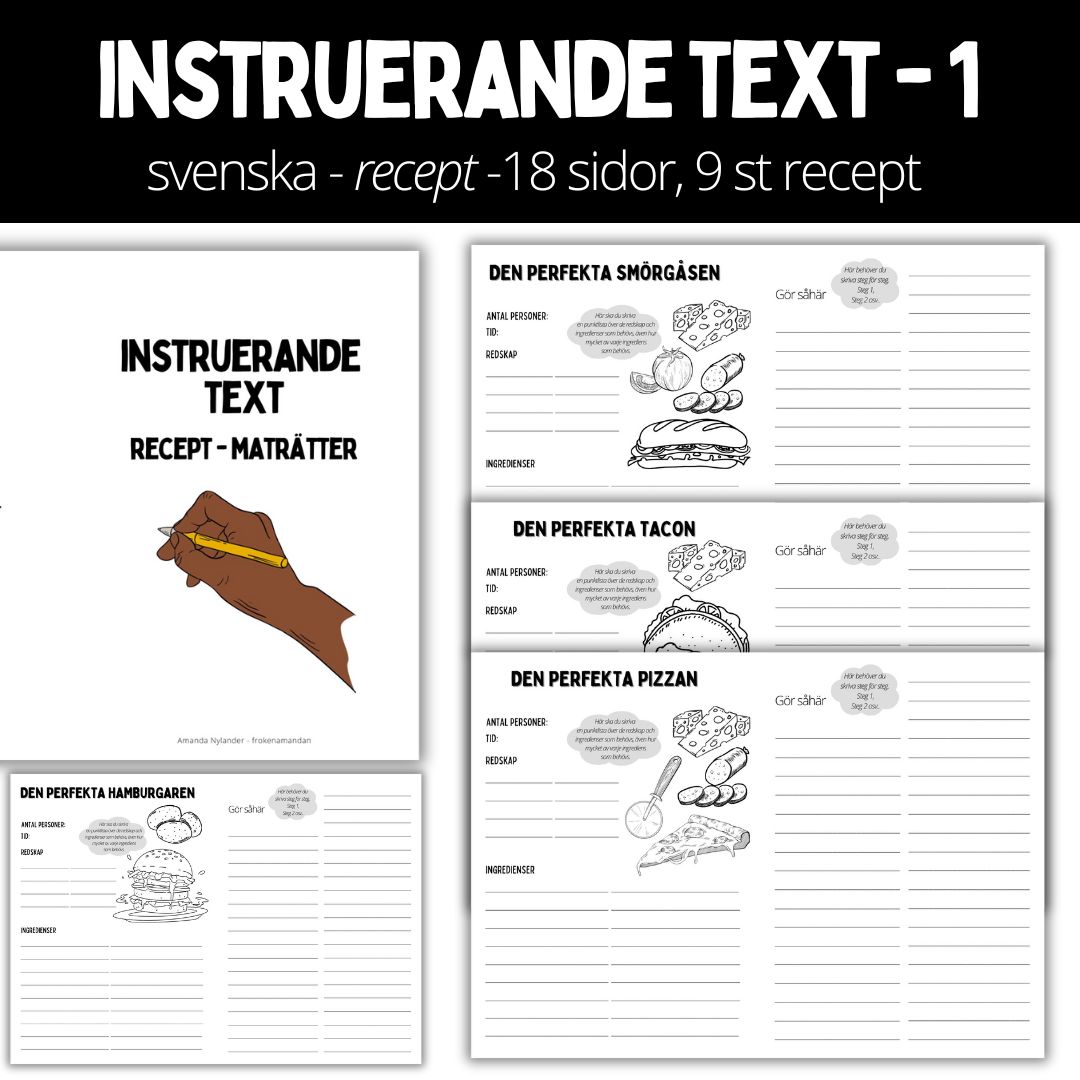 En arbetsbok på 18 sidor där eleverna får träna på att skriva instruerande texter med fokus på recept. Boken har 9 rubriker / recept som eleven kan utgå från när hen övar på att skriva instruerande texter. Boken innehåller även bilder som eleven kan färglägga.