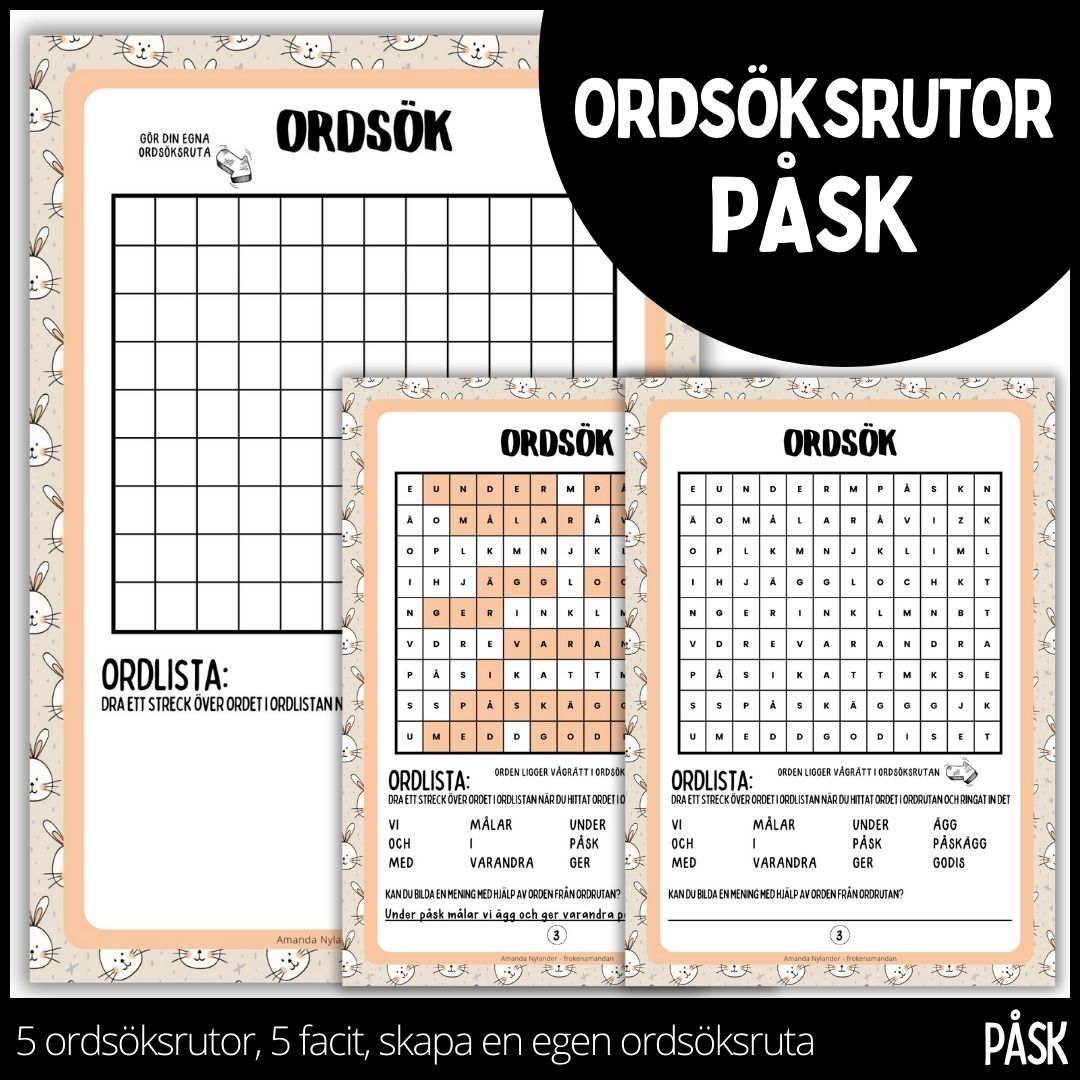 Ett arbetshäfte på 12 sidor. I arbetshäftet finns 5 stycken ordsöksrutor samt facit till vardera ordsöksruta. Efter eleverna hittat alla orden i ordrutan ska de bilda en mening med orden, även den korrekta meningen finns med på facitet. Sista sidan är en sida där eleverna själva kan göra en egen ordsöksruta med hjälp av alla de nya påskorden de lärt sig.
