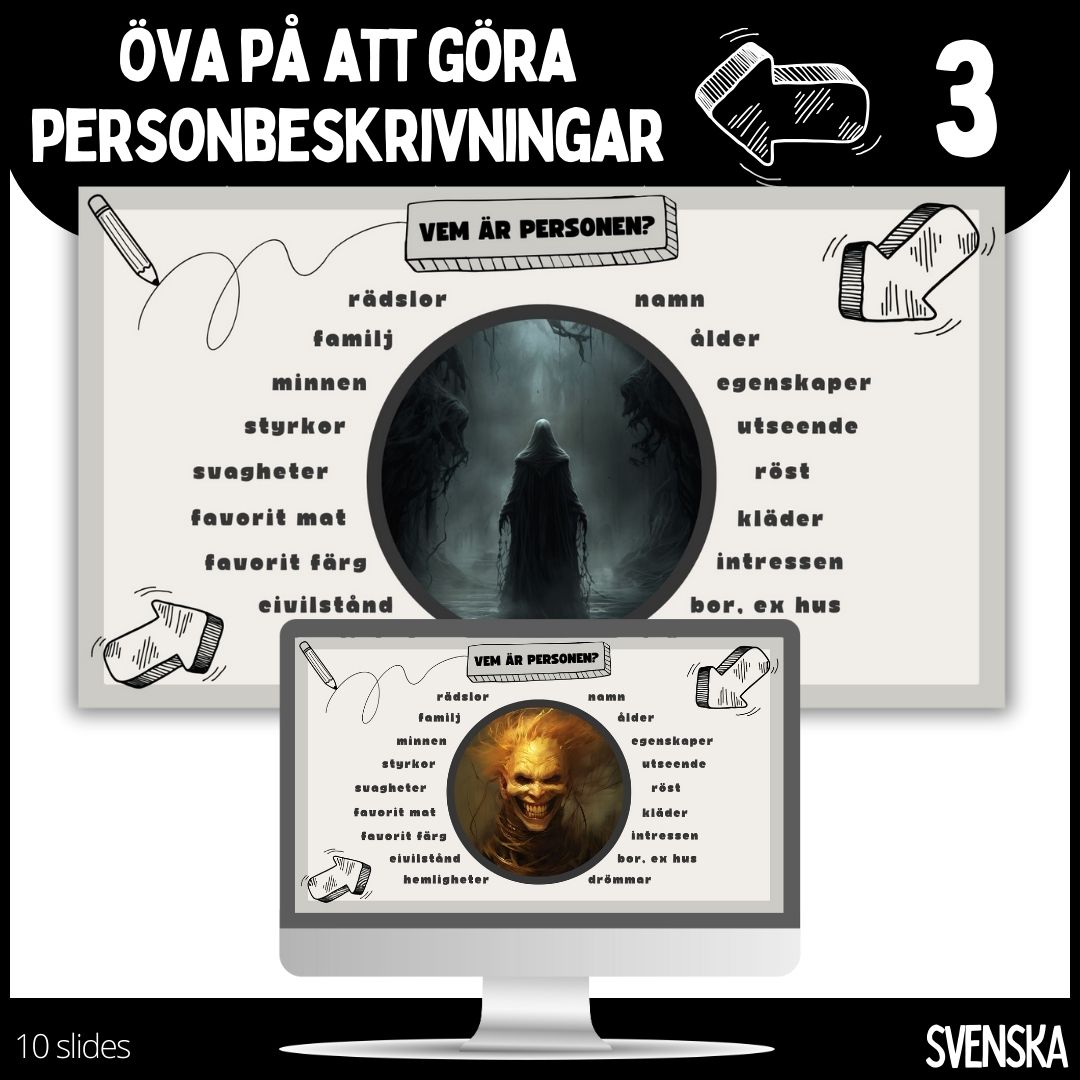 Låt eleverna öva på att skriva / göra personbeskrivningar med hjälp av denna presentation. Presentationen innehåller 10 slides med 9 olika bilder / illustrationer samt en stödstruktur som eleverna kan ta hjälp av när de ska göra sina personbeskrivningar. Presentationen är tänkt att ge eleverna möjligheten att fördjupa sina kunskaper och göra dem säkrare på att göra personbeskrivningar, något gynnar dem vid moment likt berättande text. Låt eleverna själva välja bild / illustration och låt dem sedan göra personbeskrivningen enskilt eller tillsammans i par eller grupp.