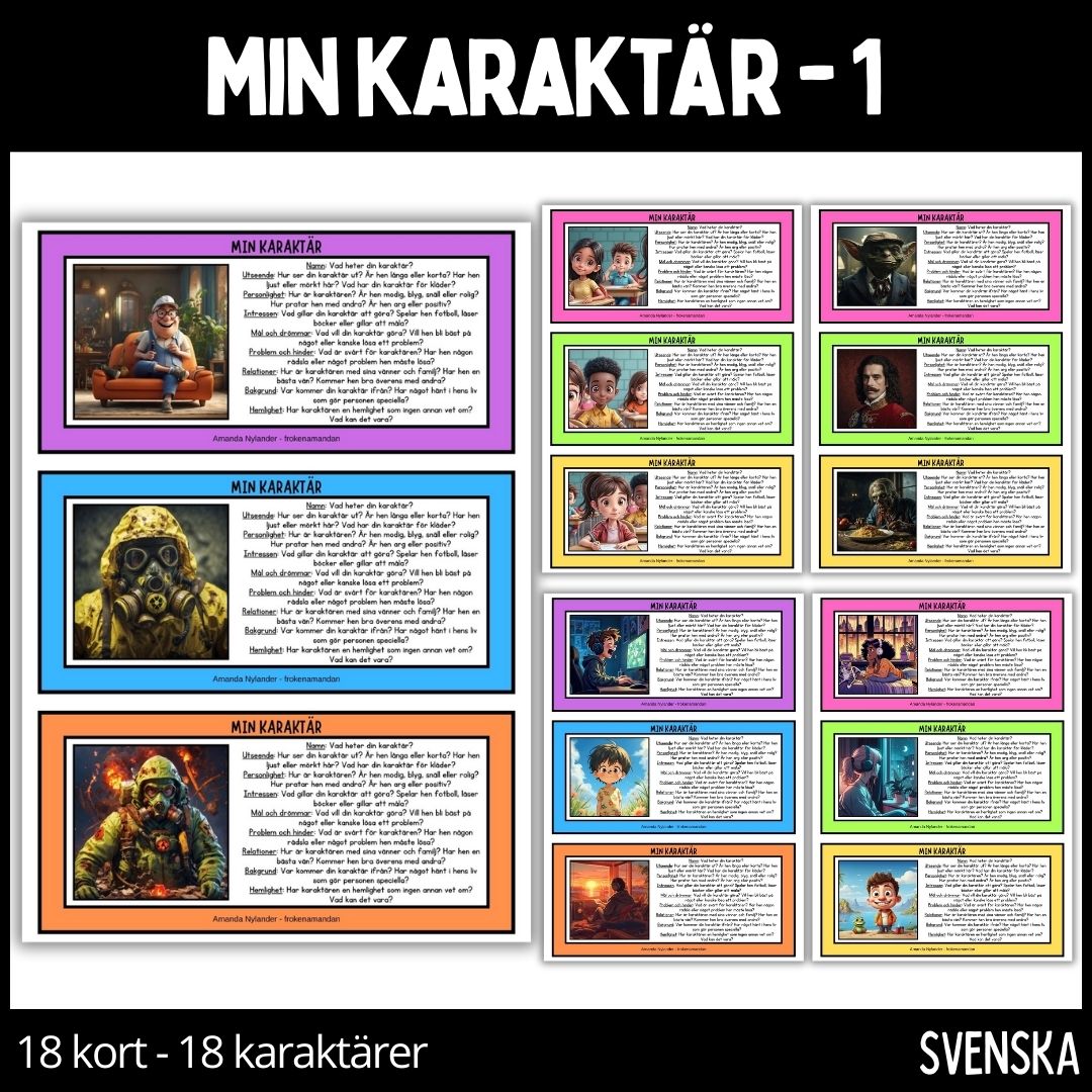 Låt eleverna öva på att skriva / göra personbeskrivningar med hjälp av dessa kort. Materialpaketet innehåller 18 kort med 18 olika personer / illustrationer samt en stödstruktur som eleverna kan ta hjälp av när de ska göra sina personbeskrivningar. Materialpaketet är tänkt att ge eleverna möjligheten att fördjupa sina kunskaper och göra dem säkrare på att göra personbeskrivningar, något som gynnar dem vid moment likt berättande text. Låt eleverna själva välja kort / person och låt dem sedan göra personbeskrivningen enskilt eller tillsammans i par eller grupp.