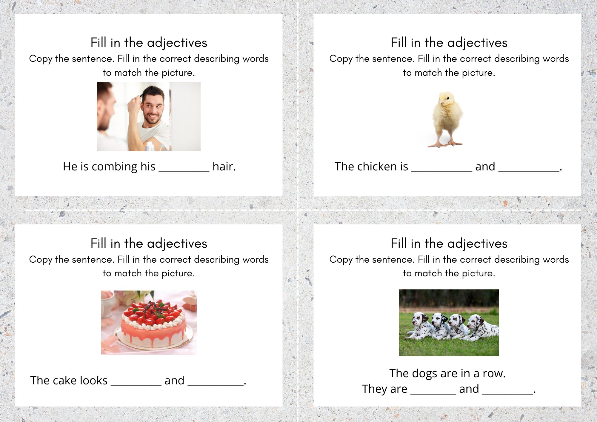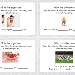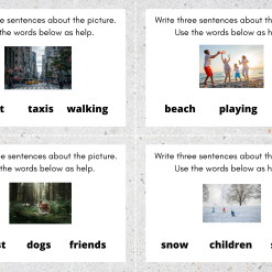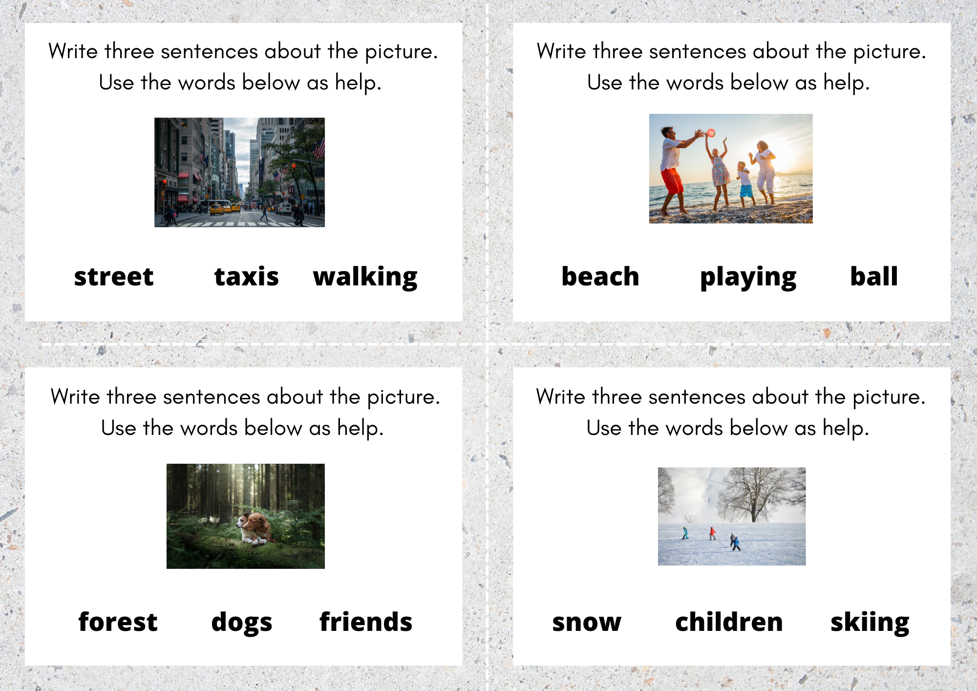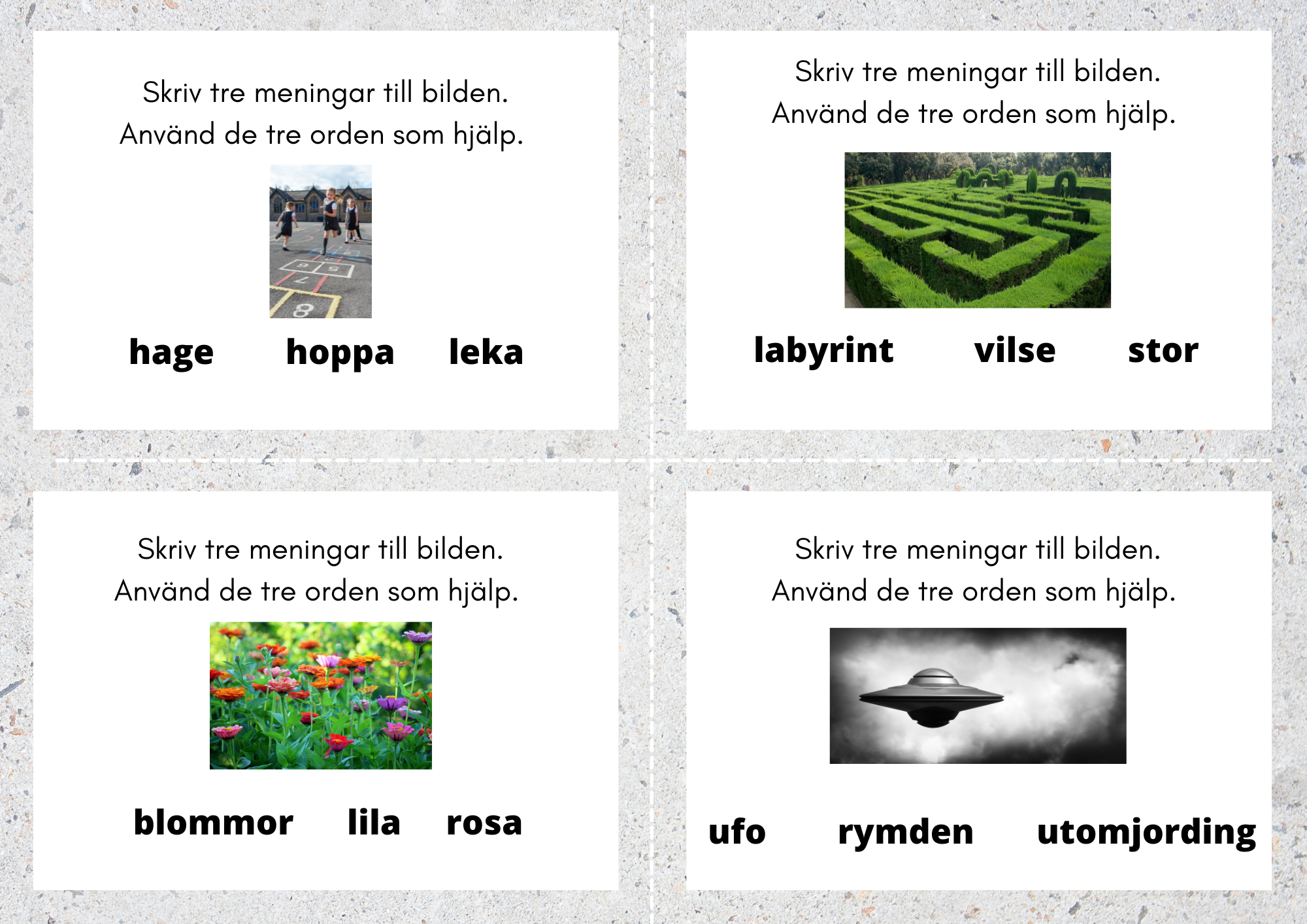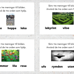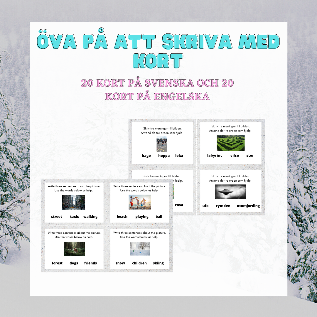 Här har du 20 kort på svenska och 20 kort på engelska där eleverna får öva på att skriva och beskriva med hjälp av olika bilder.