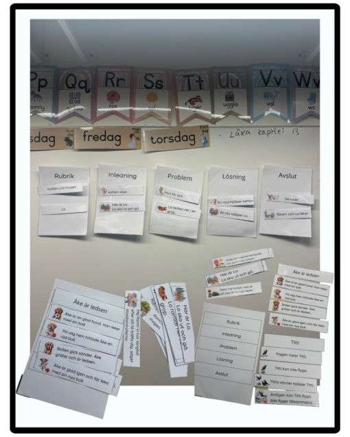 - öva på att skriva en saga tillsammans i helklass genom att placera korten i rätt del av berättelsen.