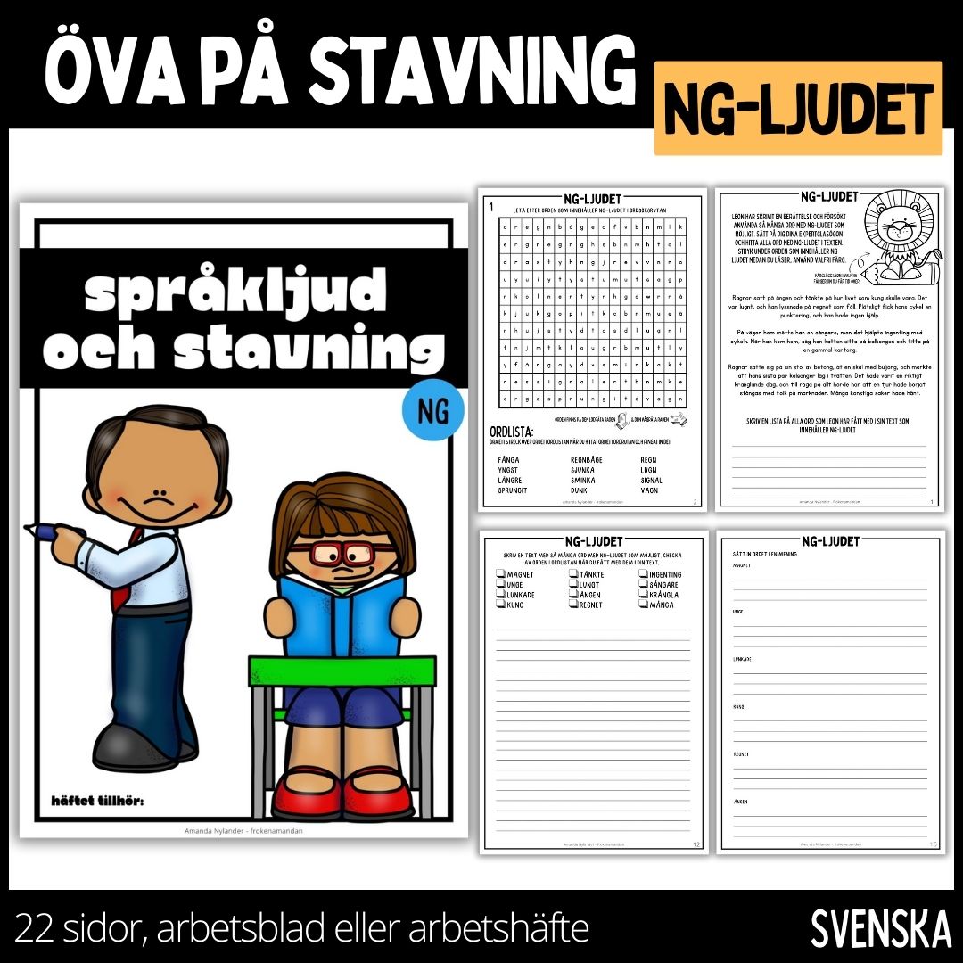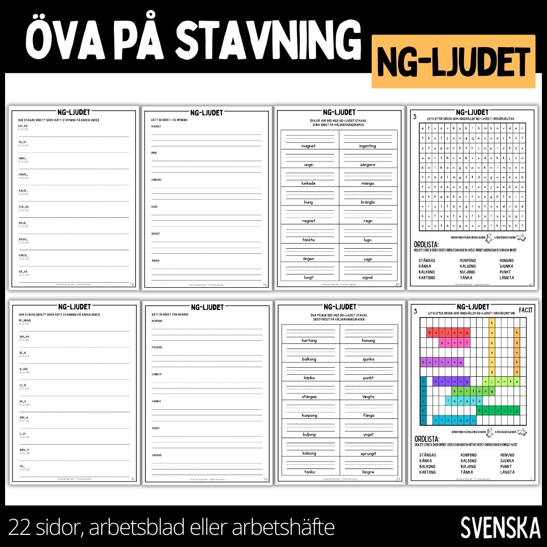 Låt eleverna öva på ord som stavas med NG-ljudet med hjälp av detta materialpaket. Materialpaketet innehåller 1 framsida och 21 arbetsblad. När jag gjort materialet har jag utgått från Klara svenskan åk 4. Materialpaketet innehåller följande uppgifter:
