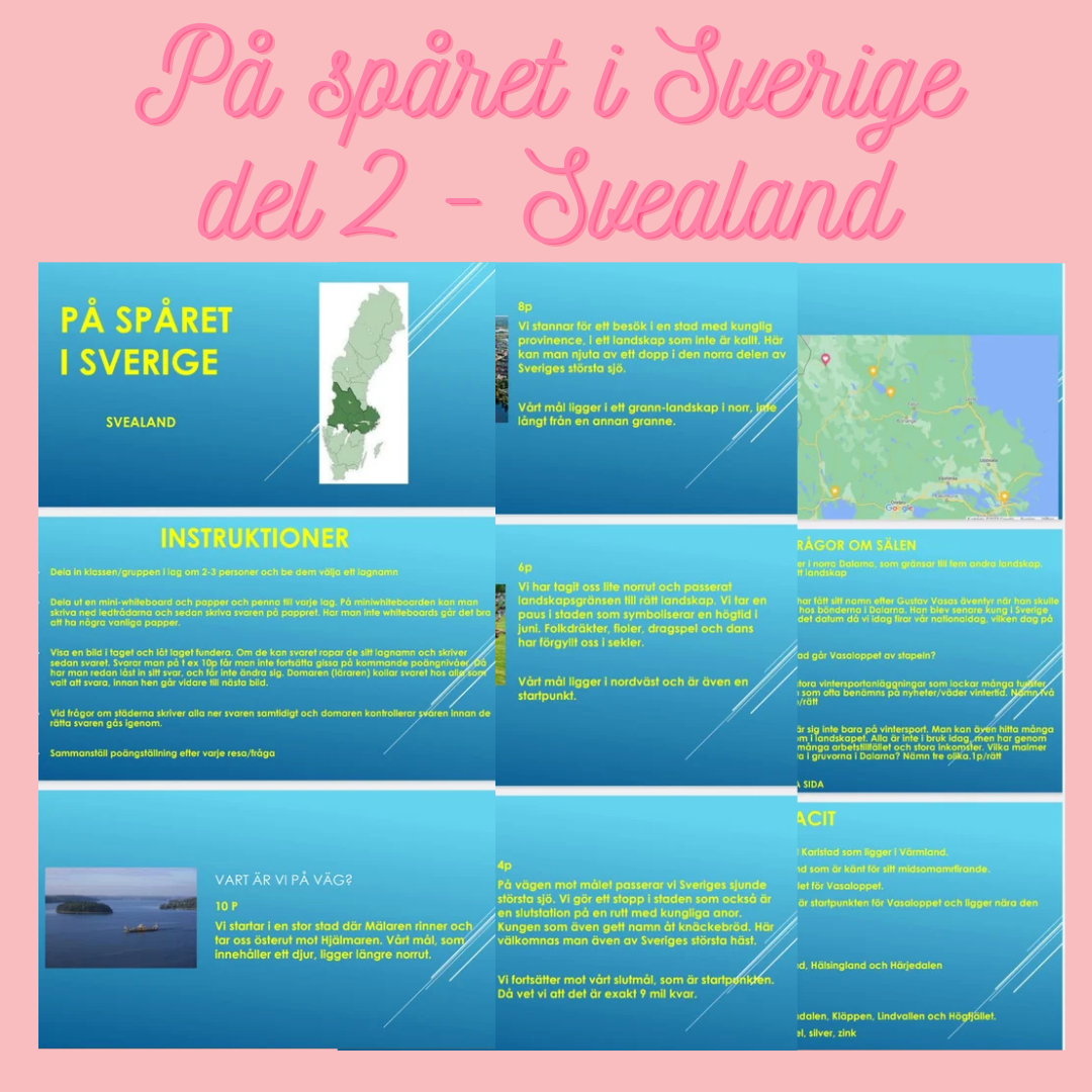 Ett roligt sätt att träna på Sveriges geografi tillsammans. Tillvägagångssättet är likt tv-programmet ”På Spåret” med en resa med ledtrådar på 10, 8, 6, 4 och 2p. Därefter är där 5st frågor om staden. Instruktioner och facit finns i materialet. Detta är andra delen, det finns även en resa i Götaland, och en i Norrland.