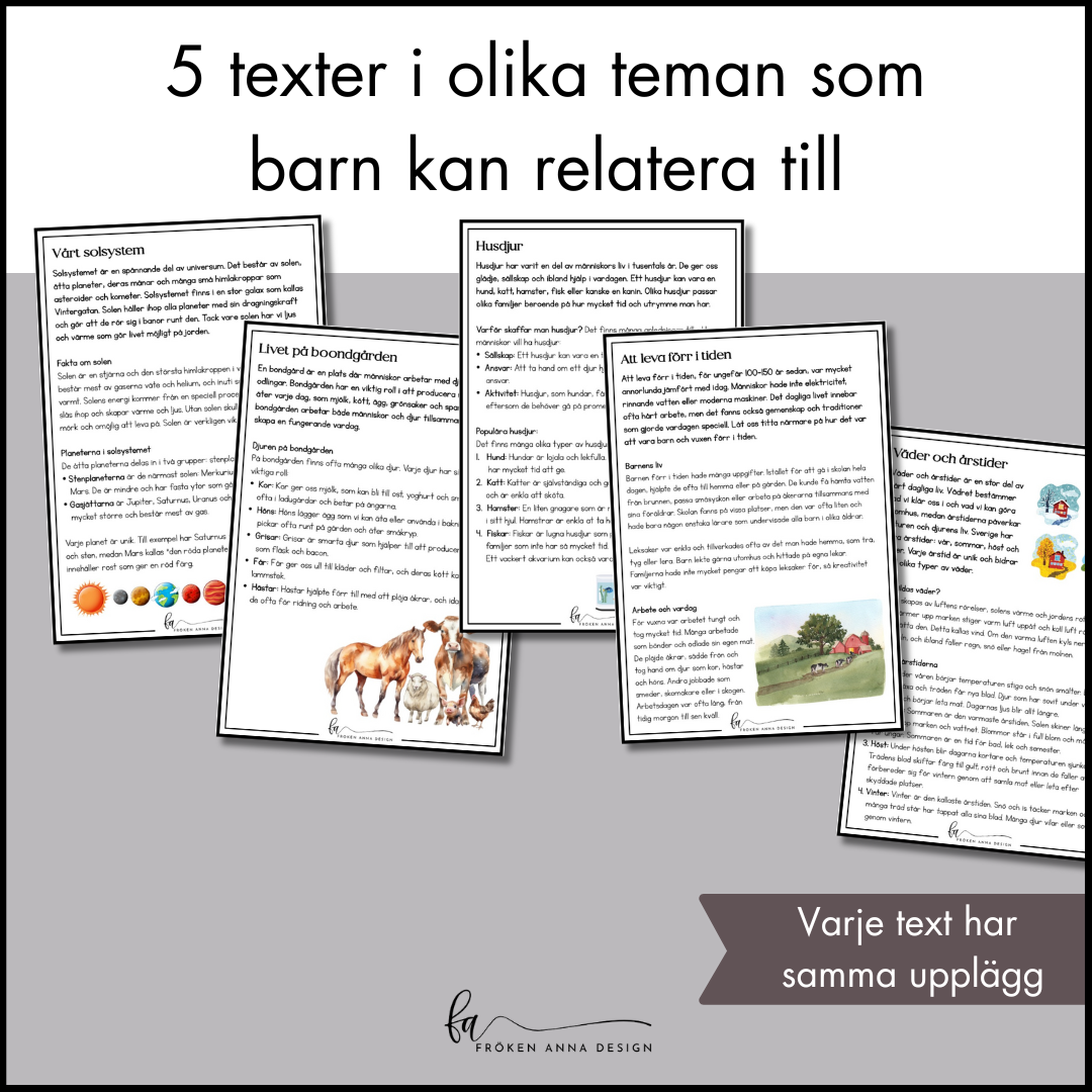 - 5 faktatexter i åldersadekvata teman (solsystemet, husdjur, bondgården, årstider och väder samt livet förr)