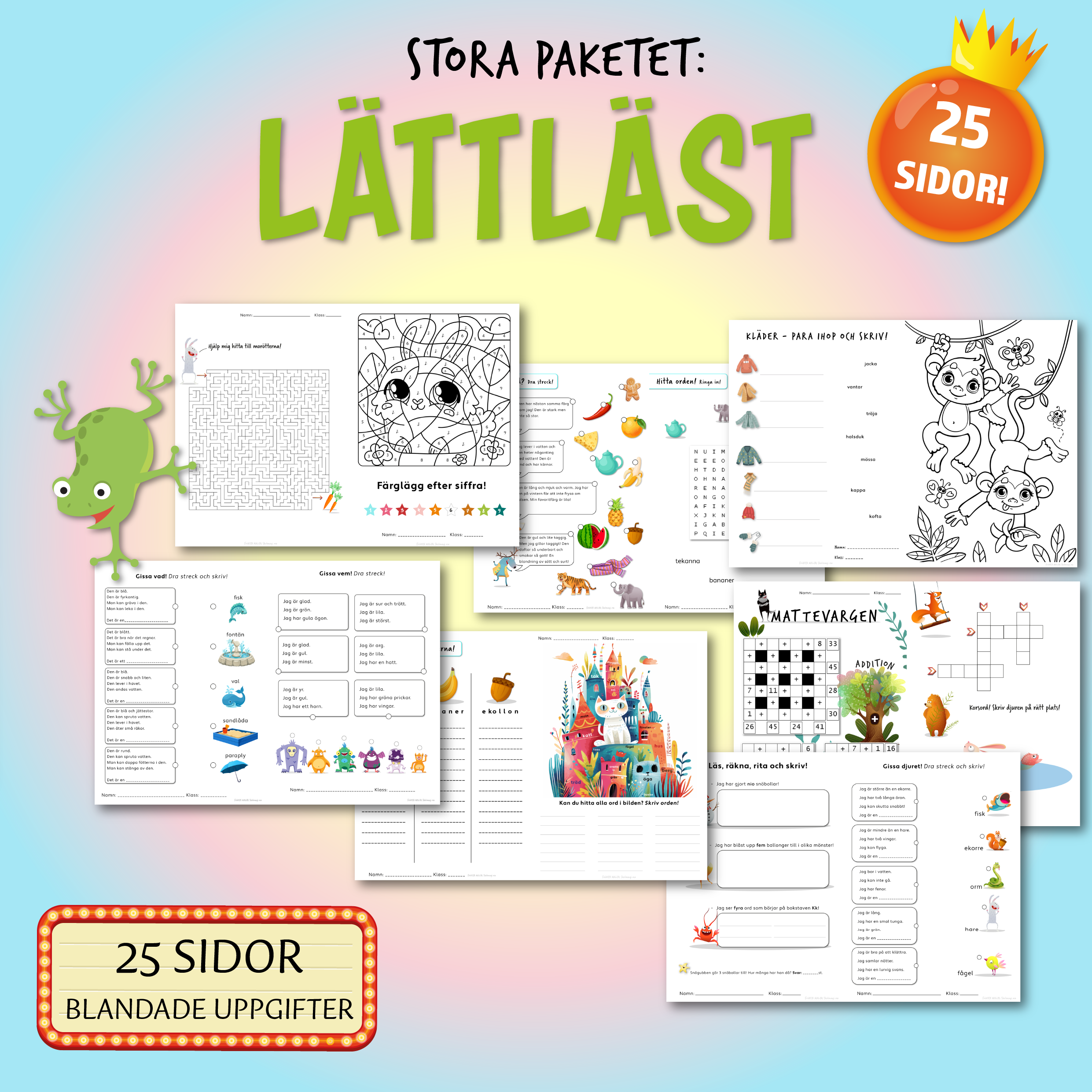 Ett häfte (25 sidor) med blandade lättlästa läs- och skrivuppgifter, målarbild samt lite matematik för nybörjarna!