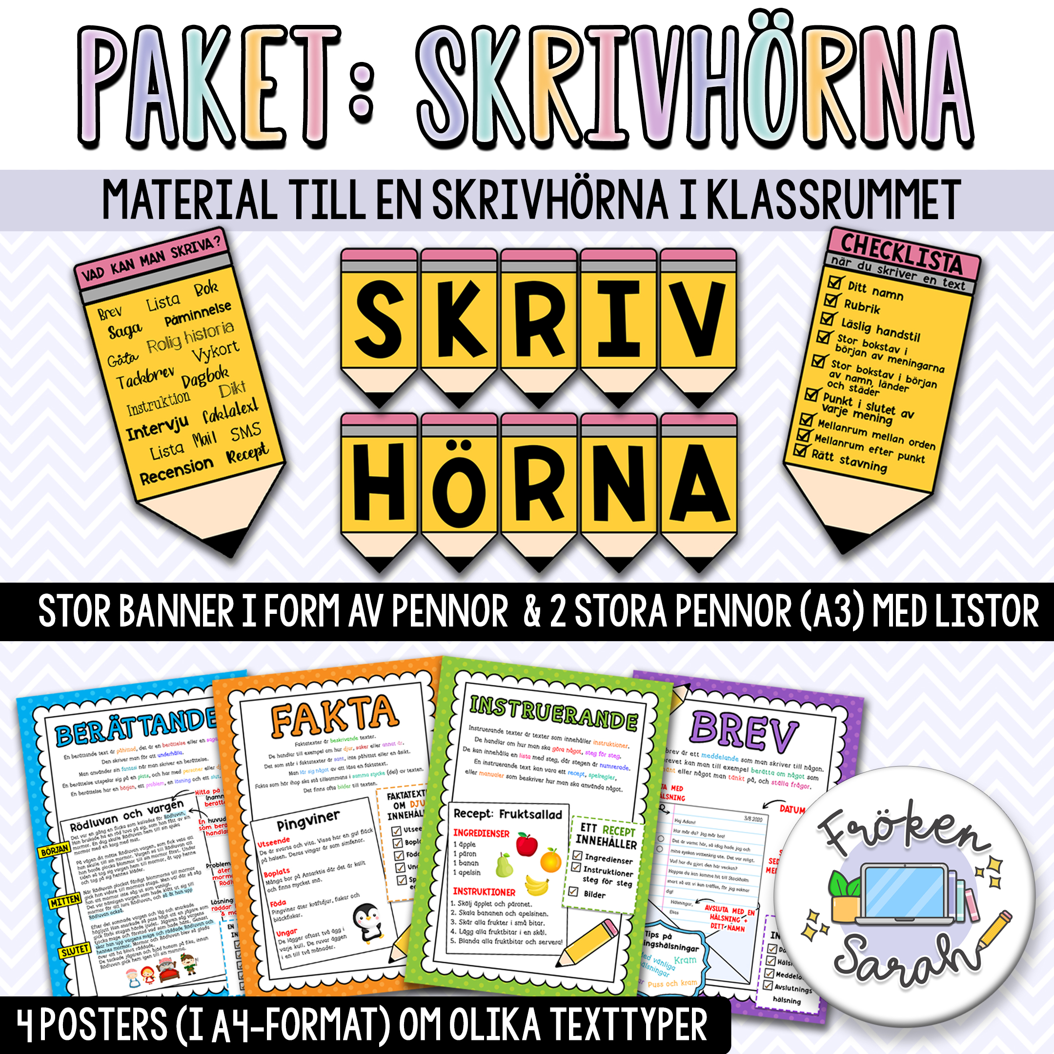 - 2 stora pennor (A3-format). Ena checklista när man skriver en text, och den andra med förslag på olika texter man kan skriva.
