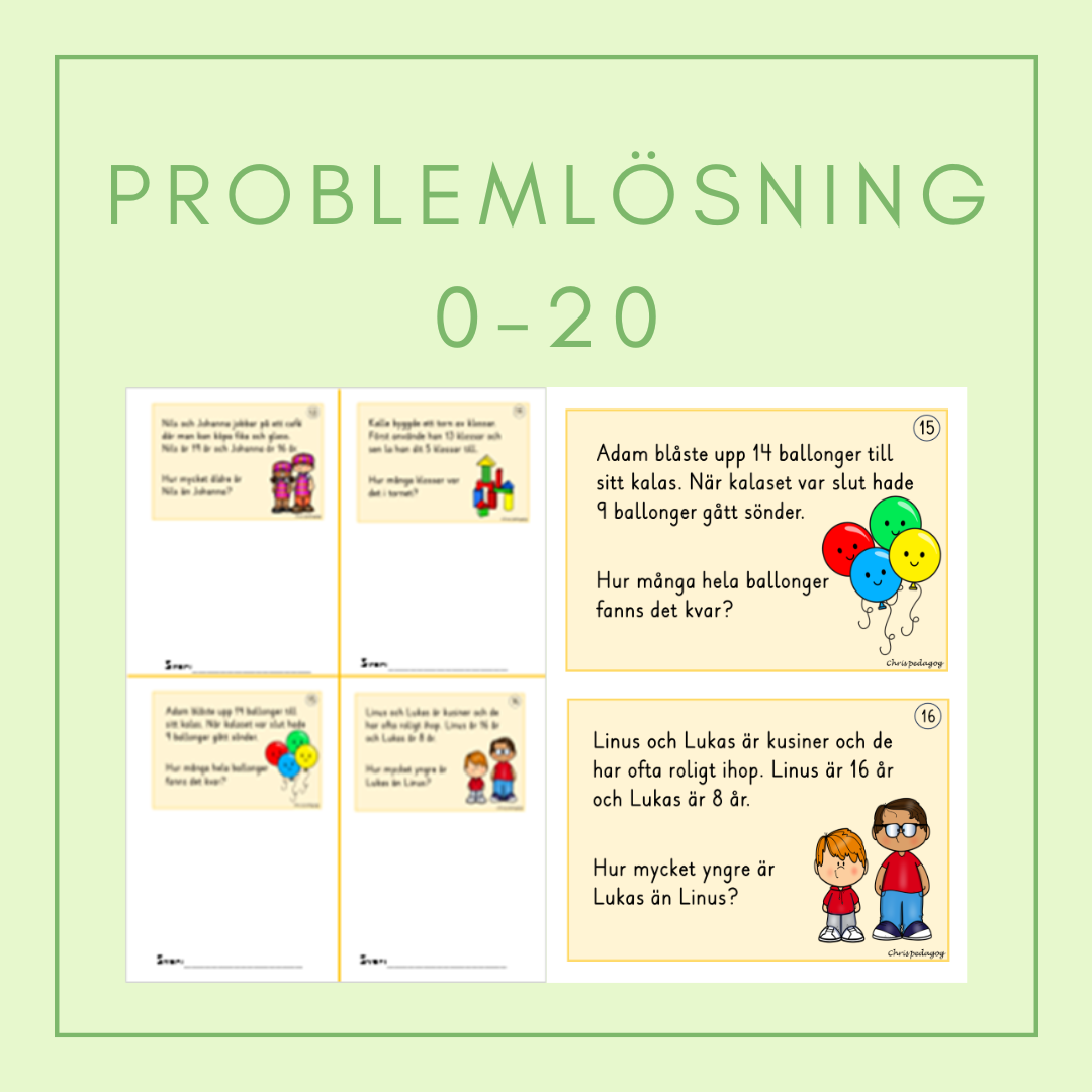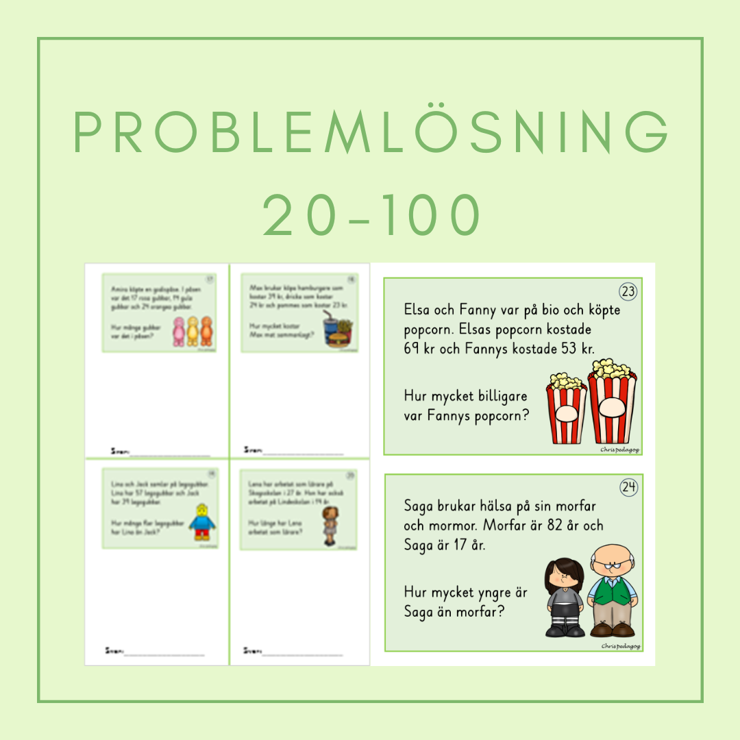Ett paket med produkterna: Problemlösning 0-20, Problemlösning 20-100, Problemlösning 100-1000 samt Problemlösning division och multiplikation. Produkterna består av kort och nu även häften som eleverna kan räkna i . Du får tre produkter till priset av fyra. Har du köpt korten tidigare kan du nu även ladda ner häftena.
