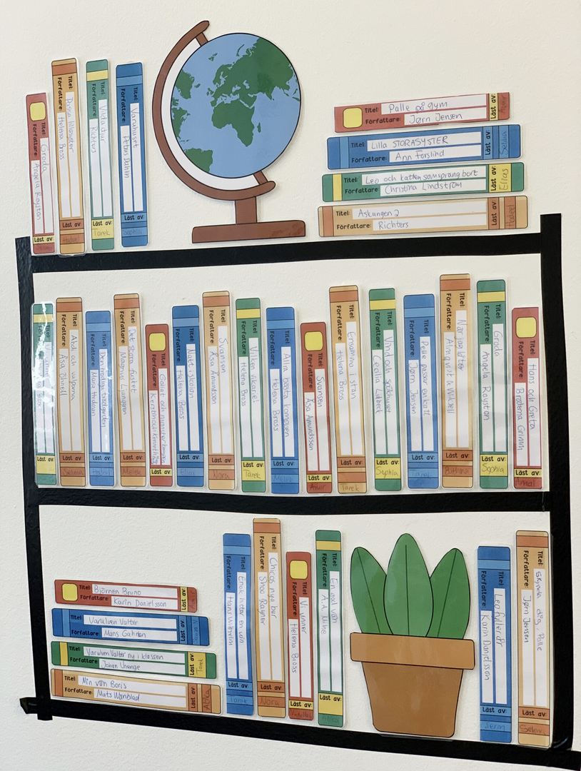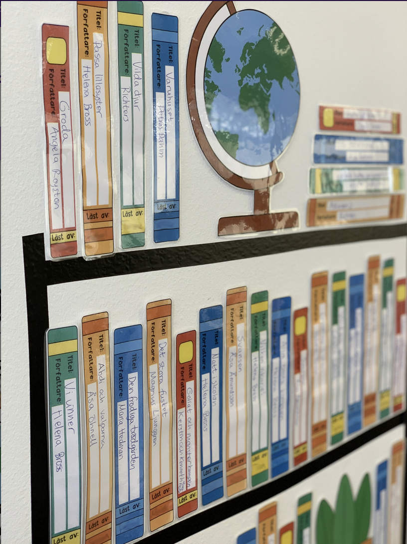 På bokryggarna kan man skriva upp alla böcker som eleverna läser