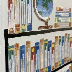 Paket med material till en sorts väggdekor som ska se ut som en bokhylla.
