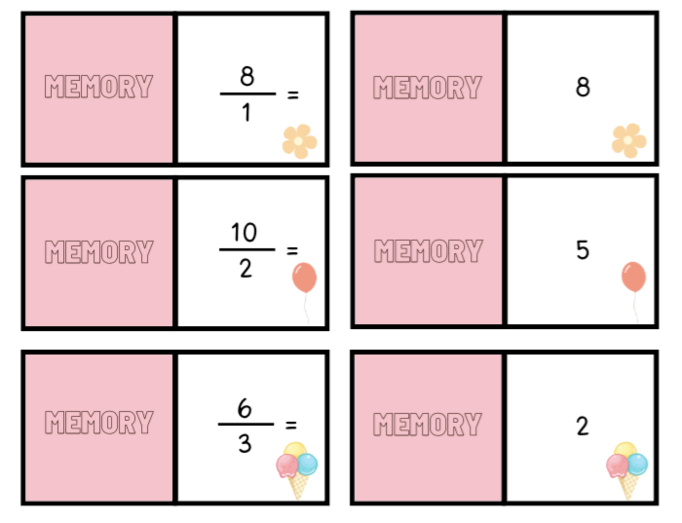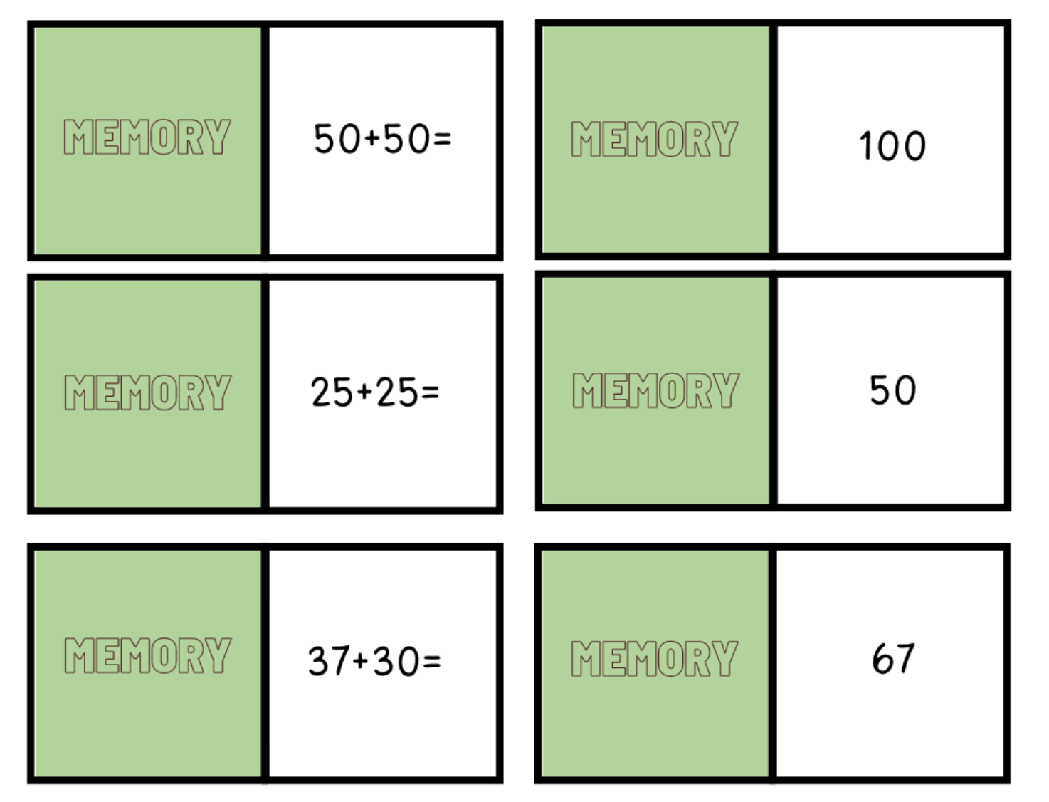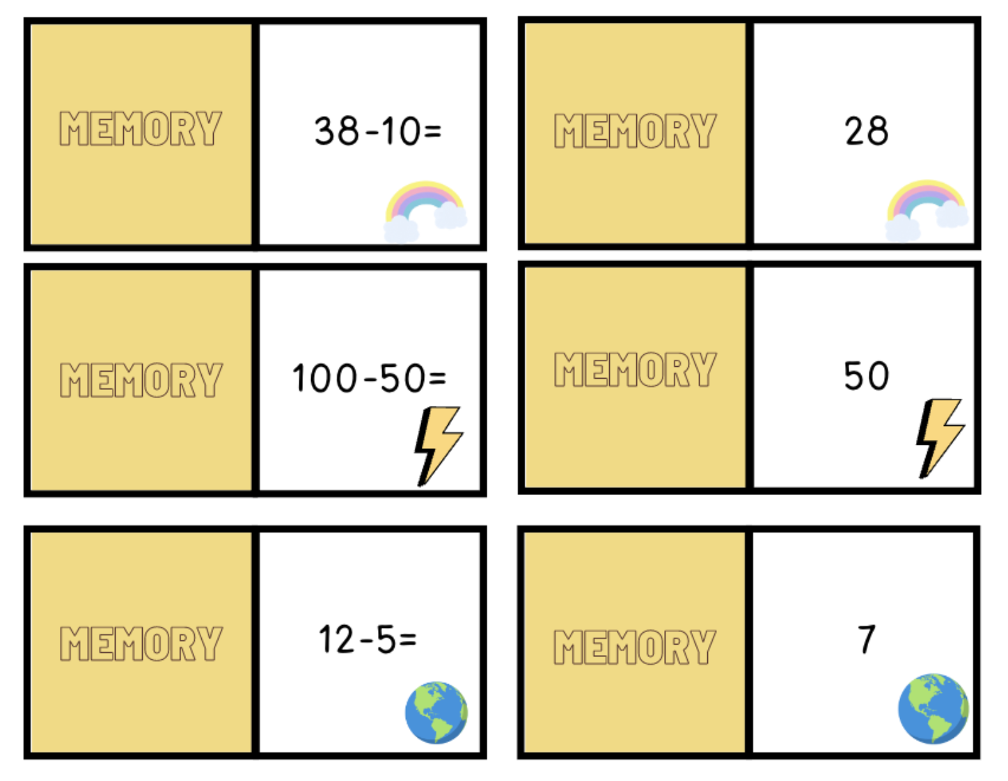 Paketet innehåller alltså fyra spel, ett för varje räknesätt. Skriv ut korten och vik dem så att det blir en fram- och baksida. Produkten kommer med två alternativ; en med stödsymboler och en utan. Stödsymbolerna är till för de elever som har svårt med de fyra räknesätten, de kan då använda symbolerna som hjälp för att veta vilka kort som hör ihop.