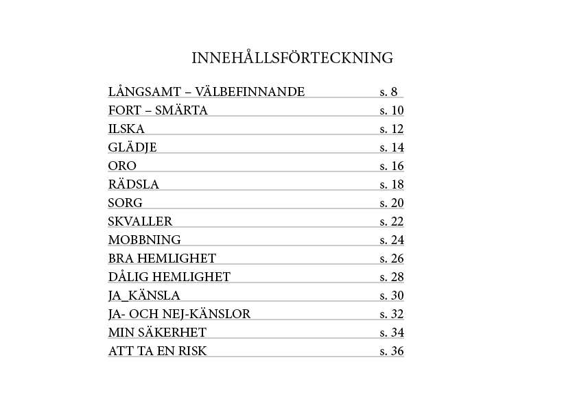 Materialet innehåller följande ämnen: Långsamt/välbefinnande, Fort/smärta, Ilska, Glädje, Oro, Rädsla, Sorg, Skvaller, Mobbning, Bra hemlighet, Dålig hemlighet, Ja-känsla, Ja- och Nej-känslor, Min säkerhet och Att ta en risk.