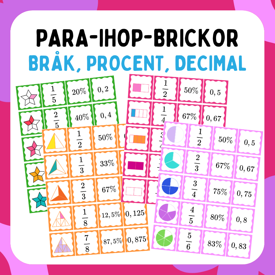 Kort att skriva ut och laminera där eleverna får träna på sambandet mellan bråk-, procent- och decimalform. Innehållet har kort med följande innehåll: