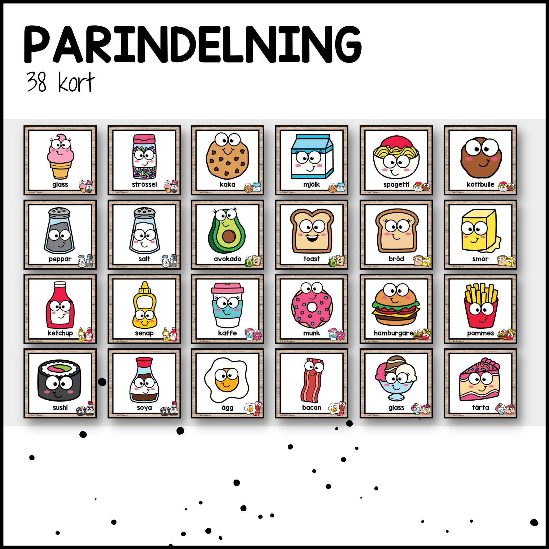 38 kort för parindelning. Klipp ut och laminera för bästa hållbarhet. Lägg sedan korten i en burk och plocka fram så många du behöver.