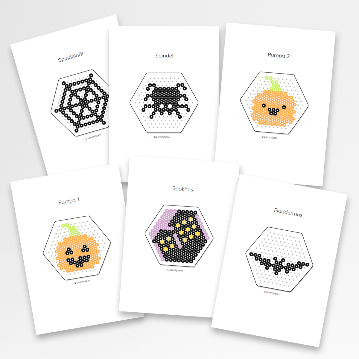 Dokumentet består av 6 pärlplattemönster till sexhörnsplattor med halloweenmotiv.