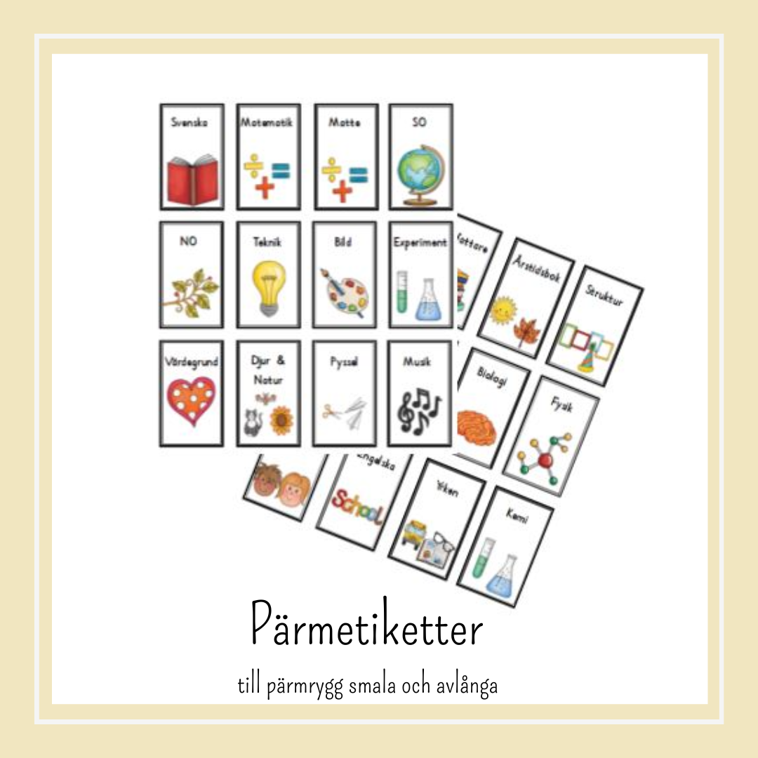 Pärmetiketter för svenska, SO, NO, matte, matematik, teknik, bild, experiment, målarbilder, författare, årstidsbok, struktur, religion, geografi, biologi, fysik, kemi, yrken, djur och natur, värdegrund, elever, pyssel, engelska och musik.