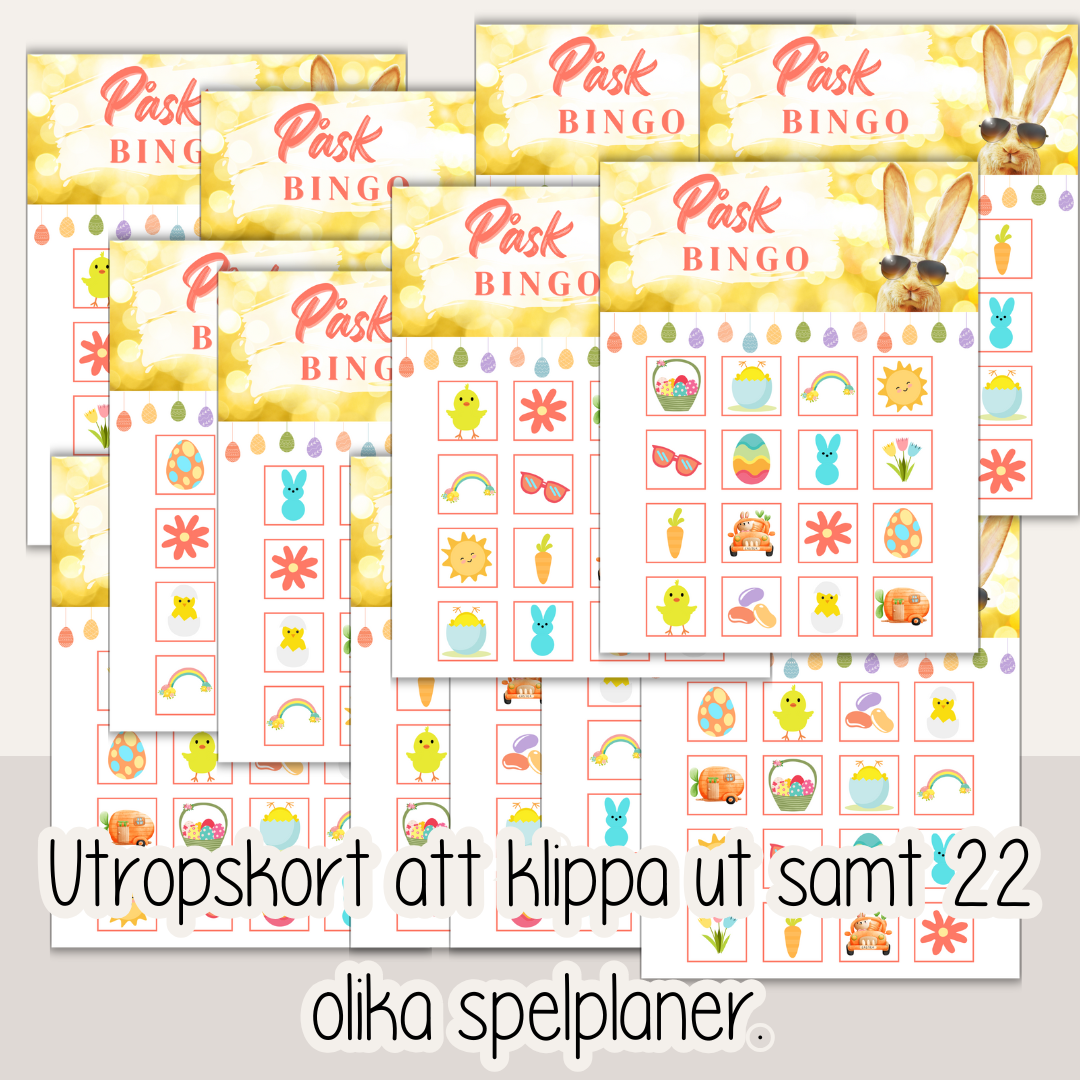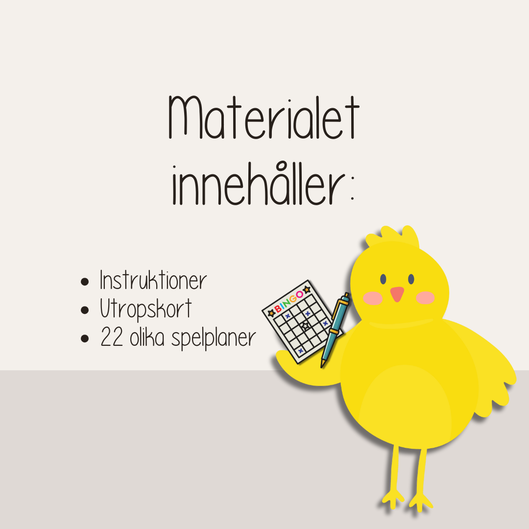 Spela påskbingo med dessa påskfigurer! Materialet innehåller 22 olika spelplaner, instruktioner och utropskort.