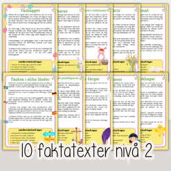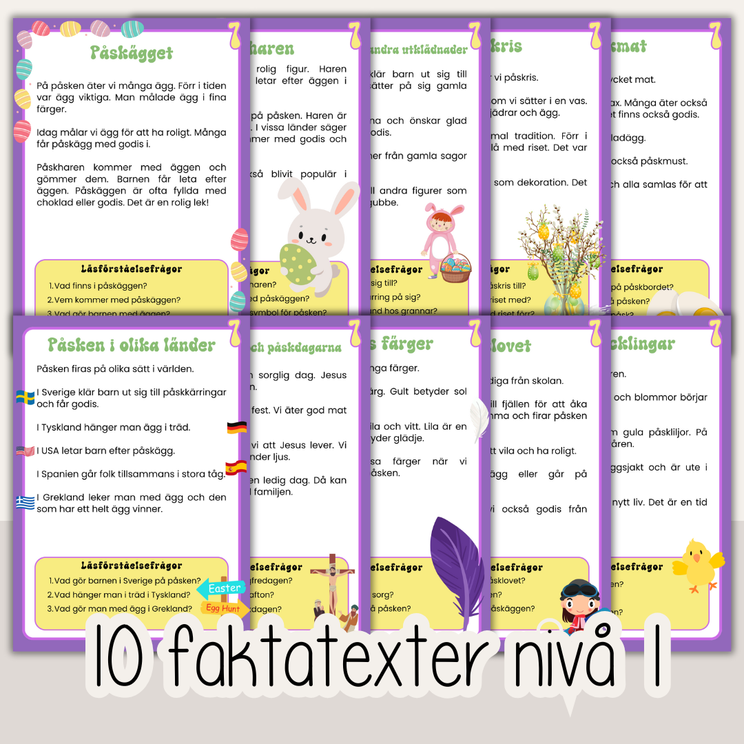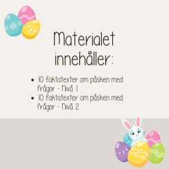 Fira in påsken med faktatexter och frågor om 10 olika påskteman. Materialet innehåller 10 olika faktatexter med tillhörande läsförståelsefrågor. Texterna finns i två olika nivåer, en mycket lättläst och en för dem som kommit igång med läsningen.