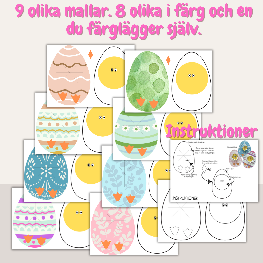 Pyssla gulliga kycklingar i påskägg. Ett relativt enkelt pyssel med nio olika mallar. En mall där man färglägger själv och 8 olika mallar i färg. Klipp, vik och limma dessa söta påskdekorationer.